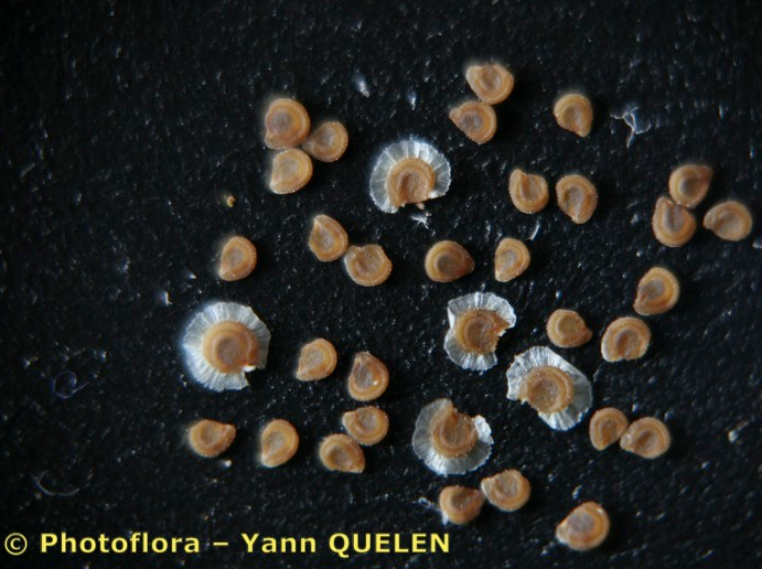 Samen hellbraun, ca. 0,5 mm groß, ohne Hautsaum, fein runzelig, ohne Stacheln