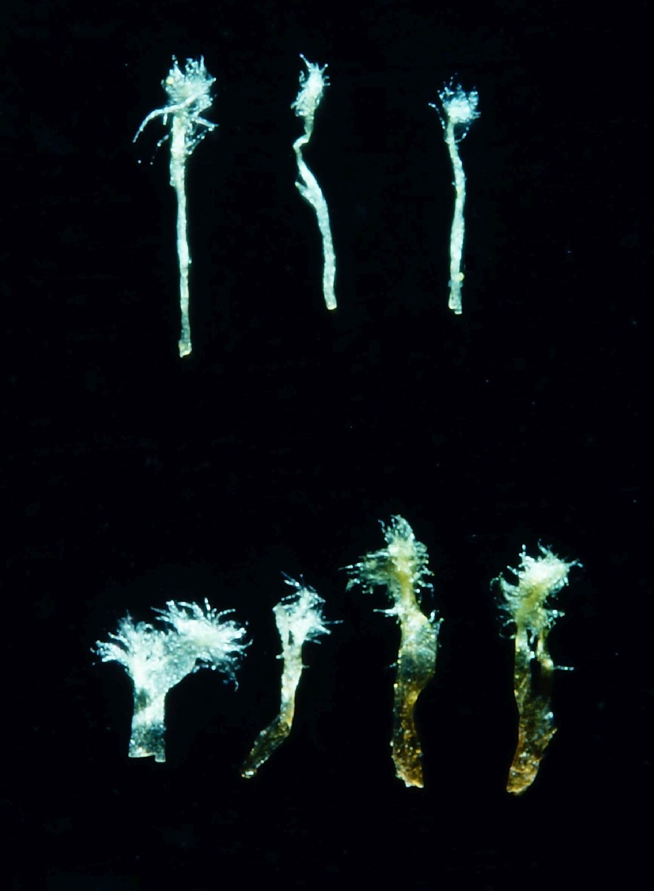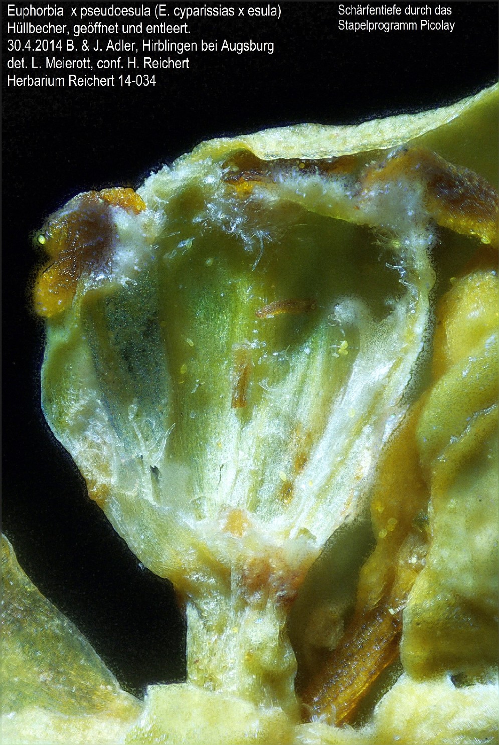 Bei Euphorbia x pseudoesula sind die Haarleisten an den Innenwänden des Hüllbechers mehr oder weniger kümmerlich ausgebildet. Die Haare stehen locker, und manchmal reichen die Haarleisten nicht bis zum Grund des Bechers hinab.