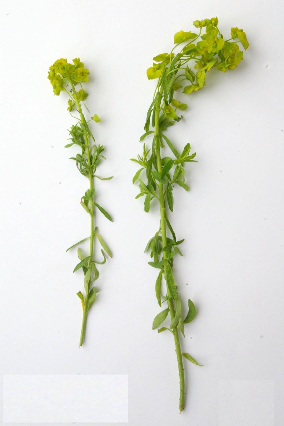Mittlere Stängelblätter breiter als die Blätter von Euphorbia cyparissias, aber schmäler als die Blätter von Euphorbia esula