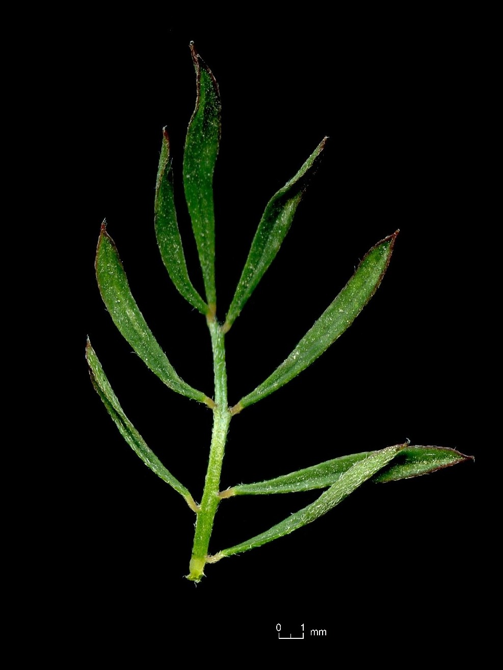 Fiederblättchen linealisch, 8 - 20 mm lang, 1 - 3,6 mm breit, gegenständig oder wechselständig, auf der Oberseite kahl, auf der Unterseite behaart