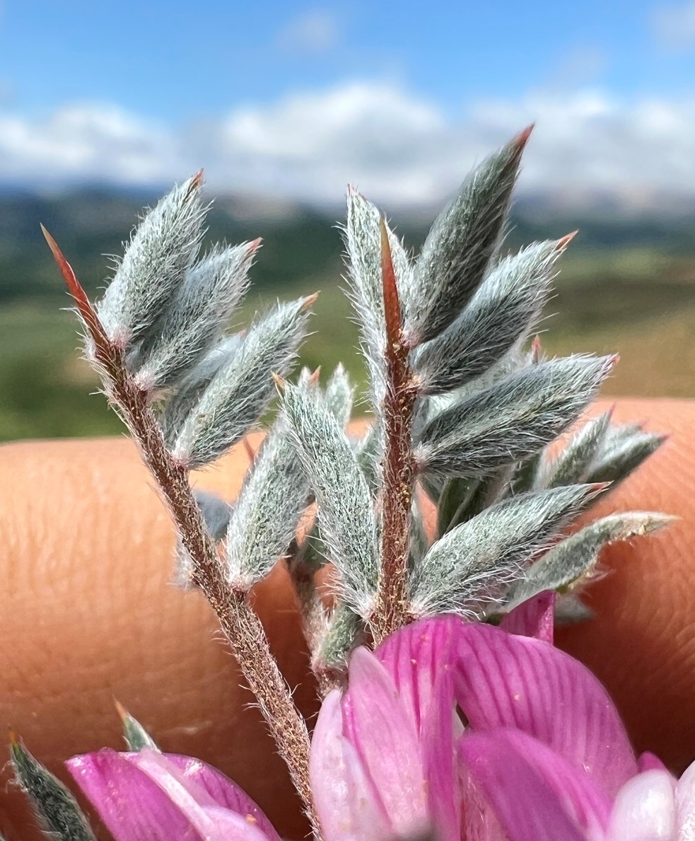 Blättchen 3 - 9 mm lang, 1 - 3 mm breit, schmal elliptisch, spitz oder stumpf vorne mit 0,2 - 0,5 mm langem Stachelspitzchen, beiderseits dich graufilzig oder seidig behaart Stipeln 7 - 9 mm, schmal dreieckig, dicht behaart