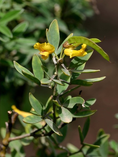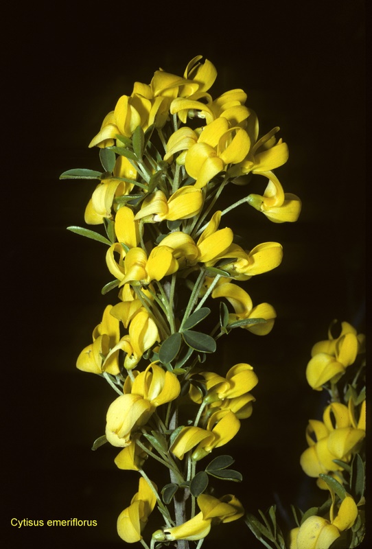 Cytisus - Blütenstand traubig, Blüten gelb, Kelch ca. so lang wie breit, kahl oder spärlich behaart, Blütenstiel 2 - 3 mal so lang wie der Kelch, Blüten in den Achseln von Blättern, Blätter gestielt, dreiteilig, Blättchen lanzettlich oder elliptisch, ledrig, 20 - 50 mm lang, 7 - 20 mm breit, Früchte kahl