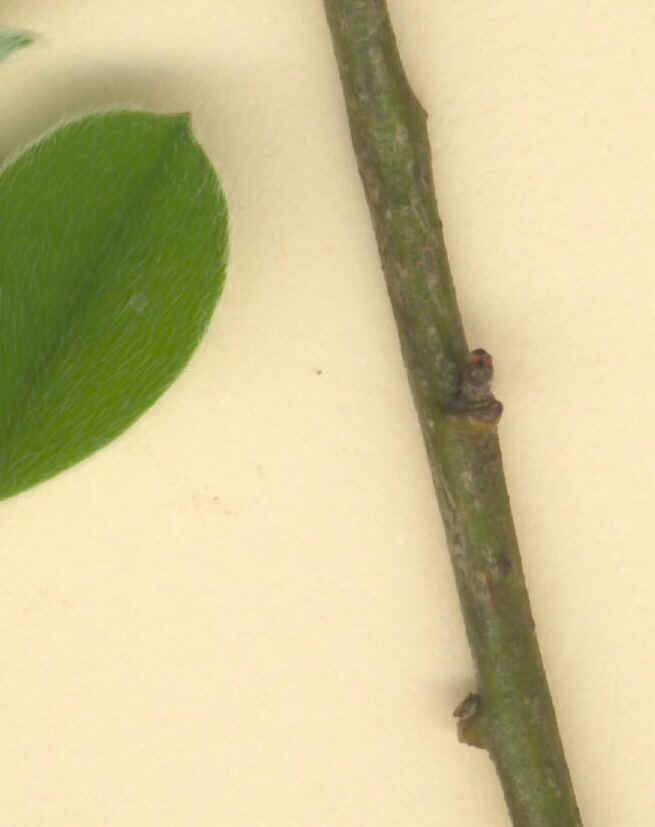 1 - 3 m hoher Strauch Zweige undeutlich gerillt Mittleres Blättchen bis 45 mm lang, deutlich größer as die seitlichen > 2