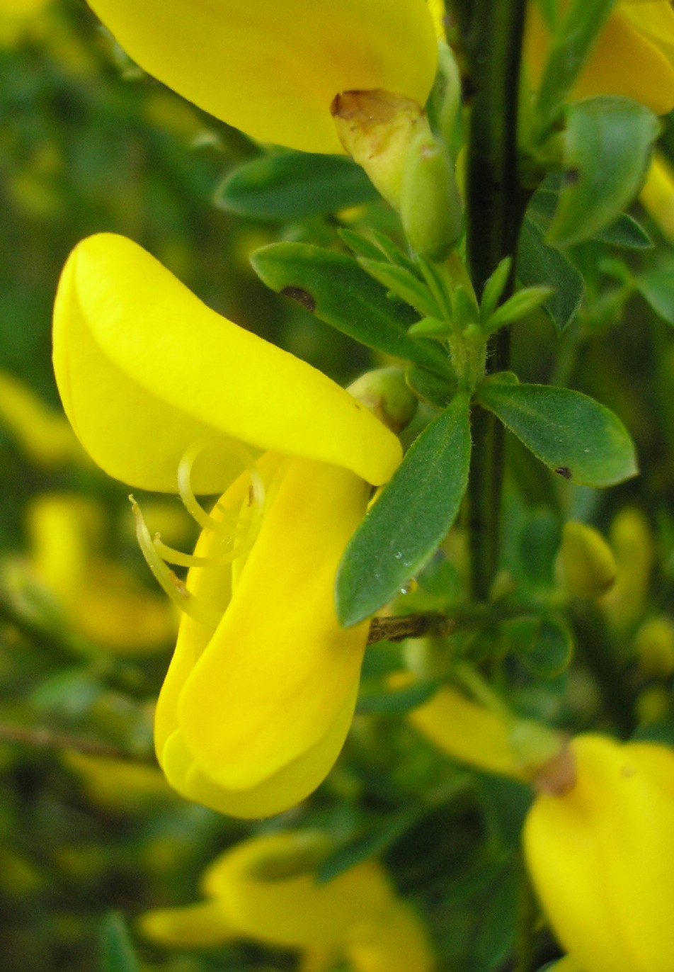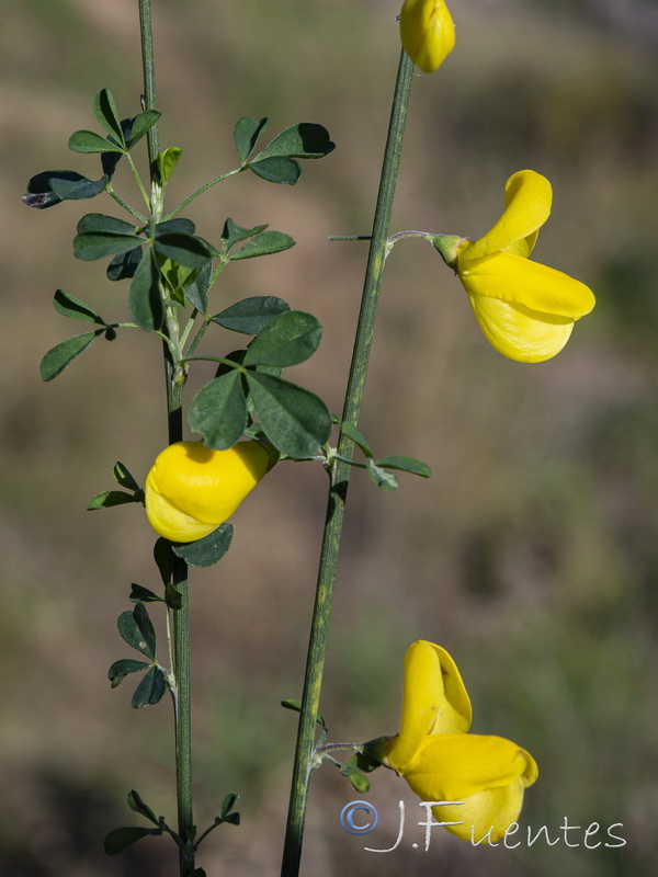 Cytisus - Blütenstand traubig, Blüten gelb, Kelch ca. so lang wie breit, kahl oder spärlich behaart, Blütenstiel 2 - 3 mal so lang wie der Kelch, Blüten in den Achseln von Blättern, Blätter gestielt, dreiteilig, Blättchen lanzettlich oder elliptisch, mehr als 3 mm breit, junge Früchte behaart