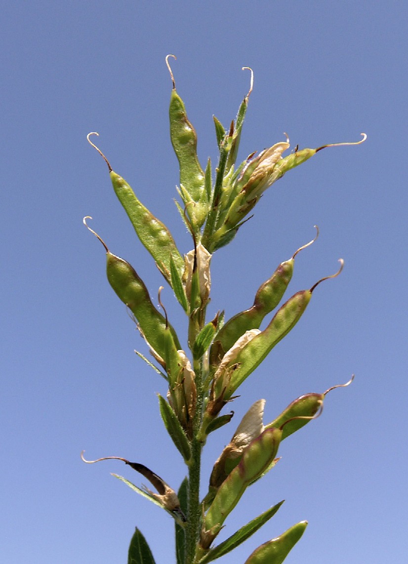 1 Pflanze aufrecht, 30 - 60 cm hoch, Blätter 4 - 6 x so lang wie breit, Hülsen kahl