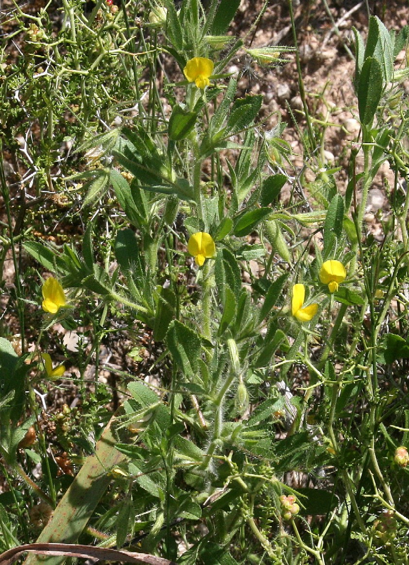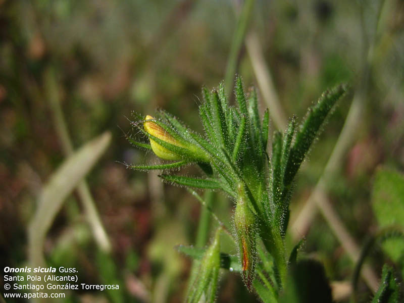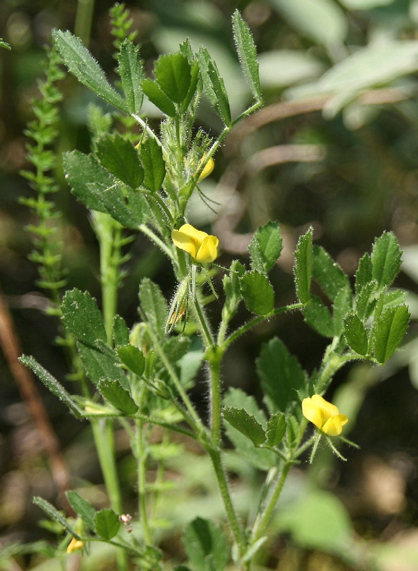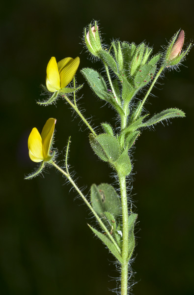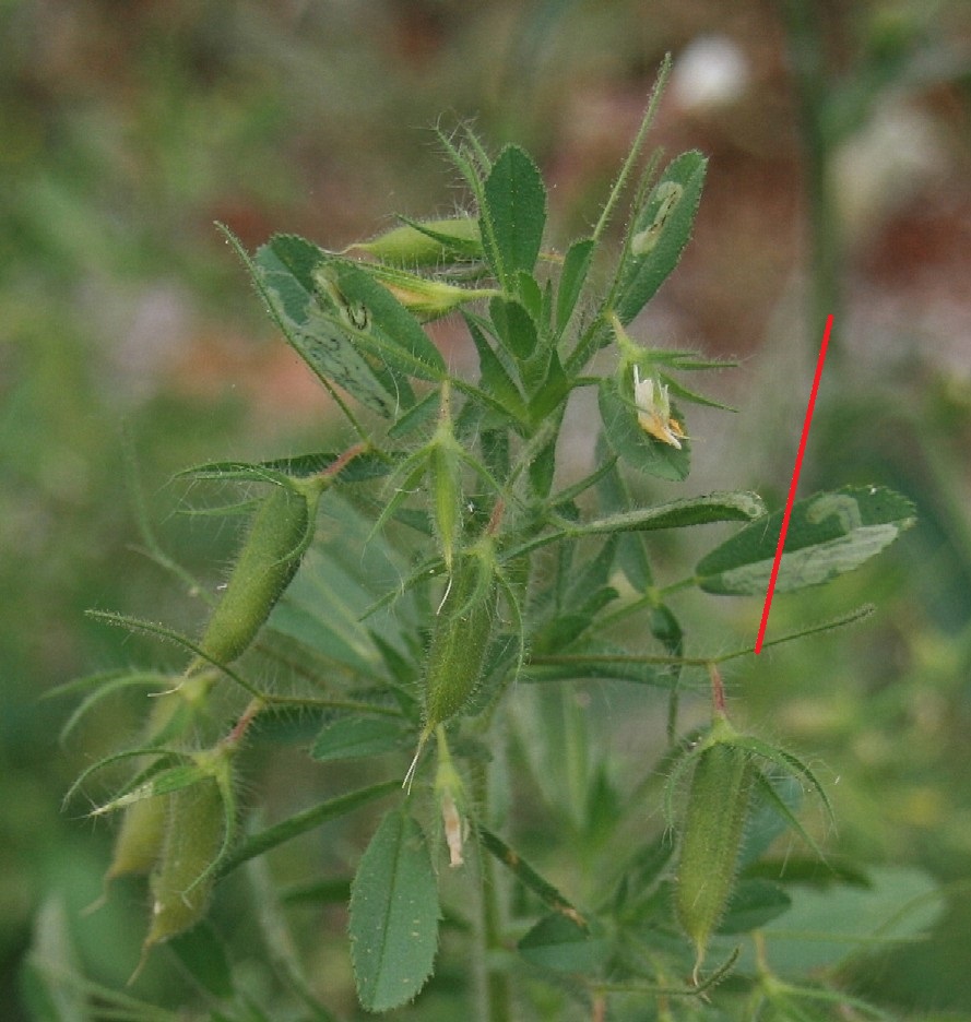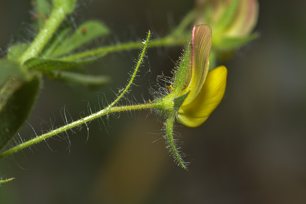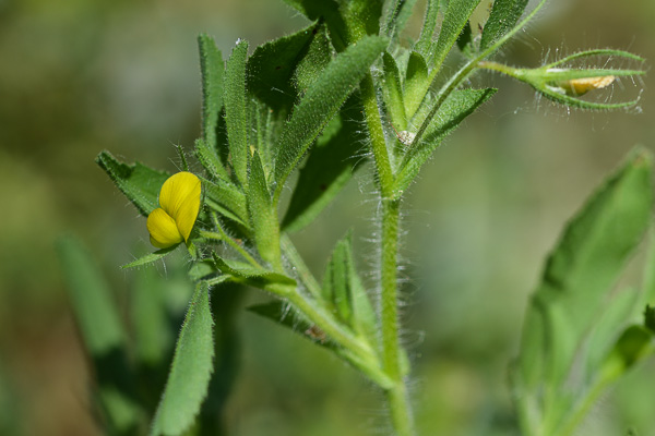 Ononis- Pflanze krautig, Blüten gelb, in 1- blütigen Rispen, Übergang vom Blütenstiel zum Rispenast mit Granne