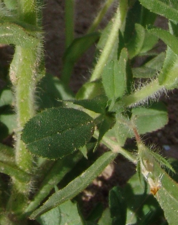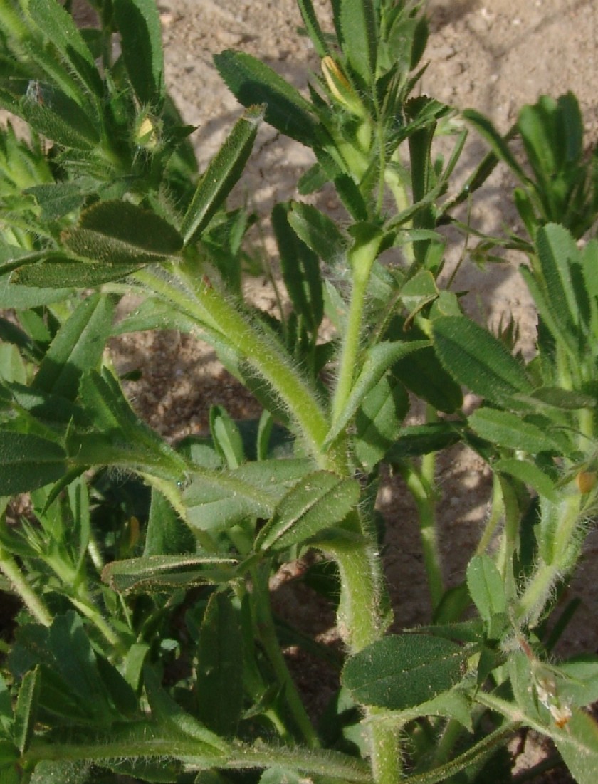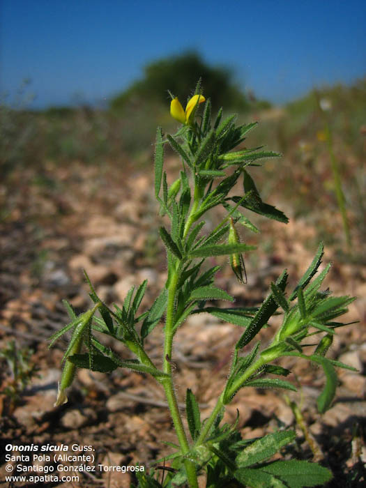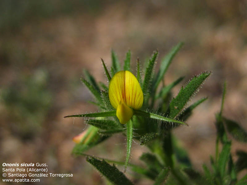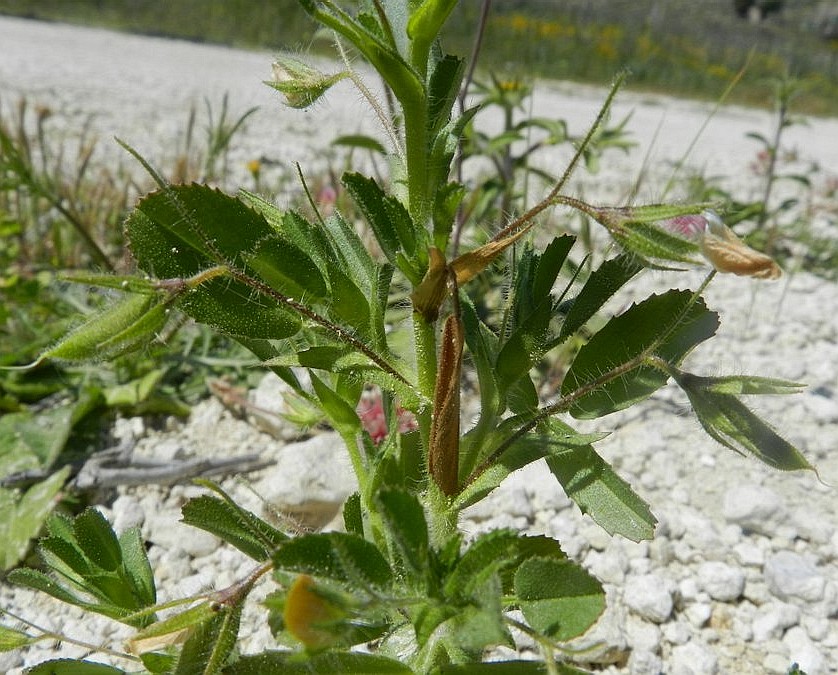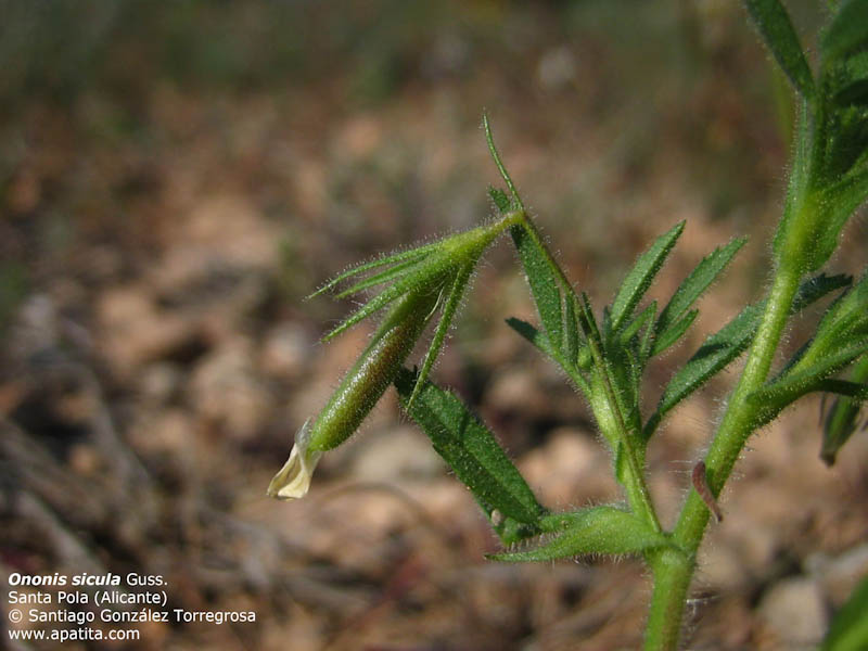 Ononis- Pflanze krautig, Blüten gelb, in 1- blütigen Rispen, Übergang vom Blütenstiel zum Rispenast mit Granne