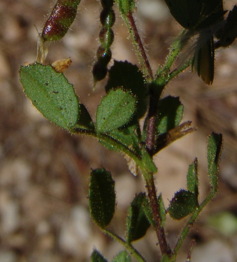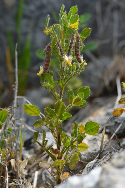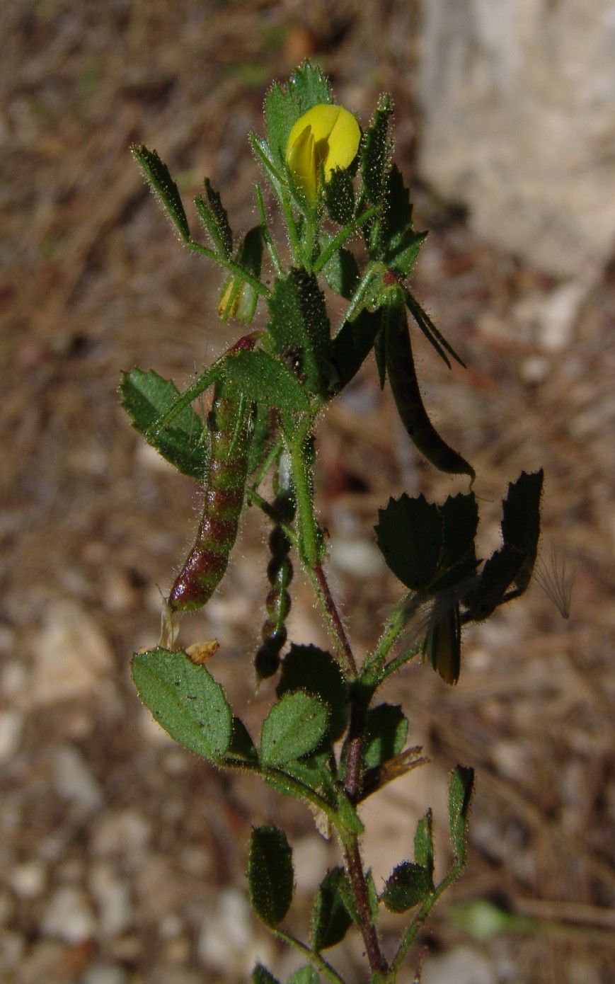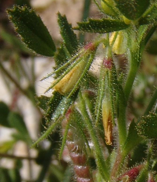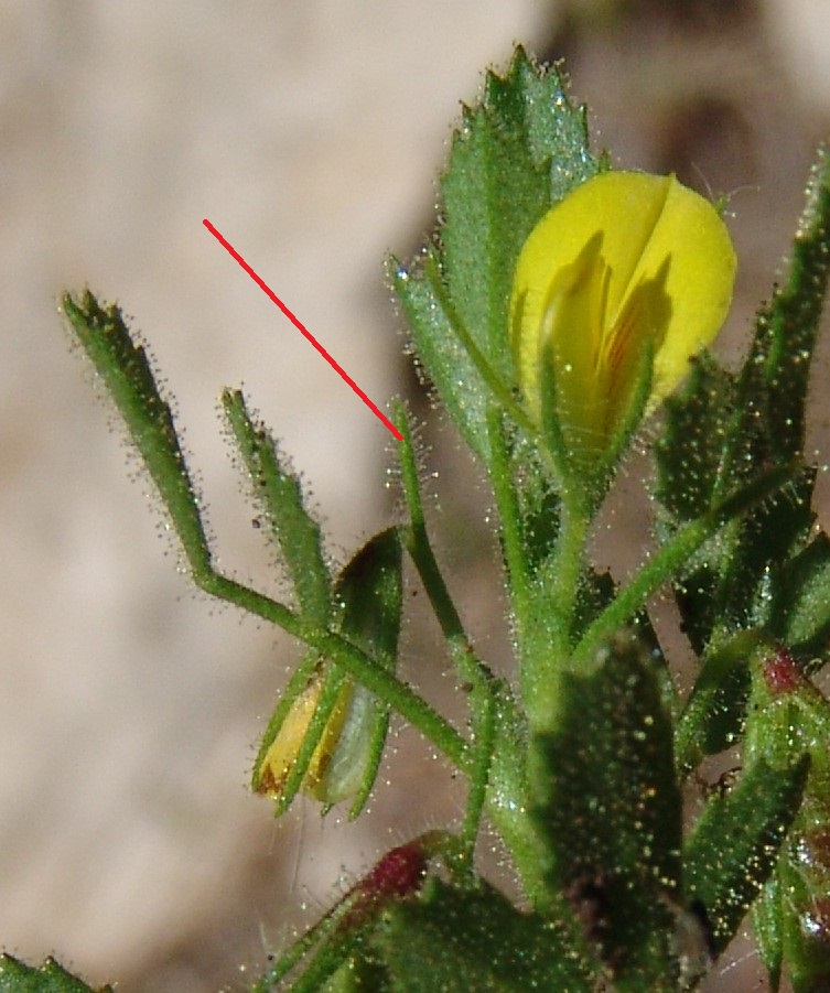 Ononis- Blüten gelb, Blätter drüsig, Übergang vom Blütenstiel zum Rispenast mit Granne,