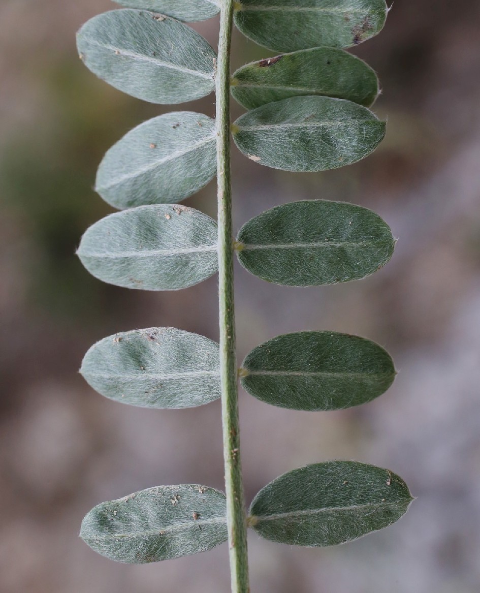 Früchte 8 - 10 mm lang, dicht langhaarig Stängel dicht filzig- langhaarig, Blätter unpaarig gefiedert, mit 9 - 12 Fiederpaaren, Nebenblätter frei oder bis zur Mitte verwachsen