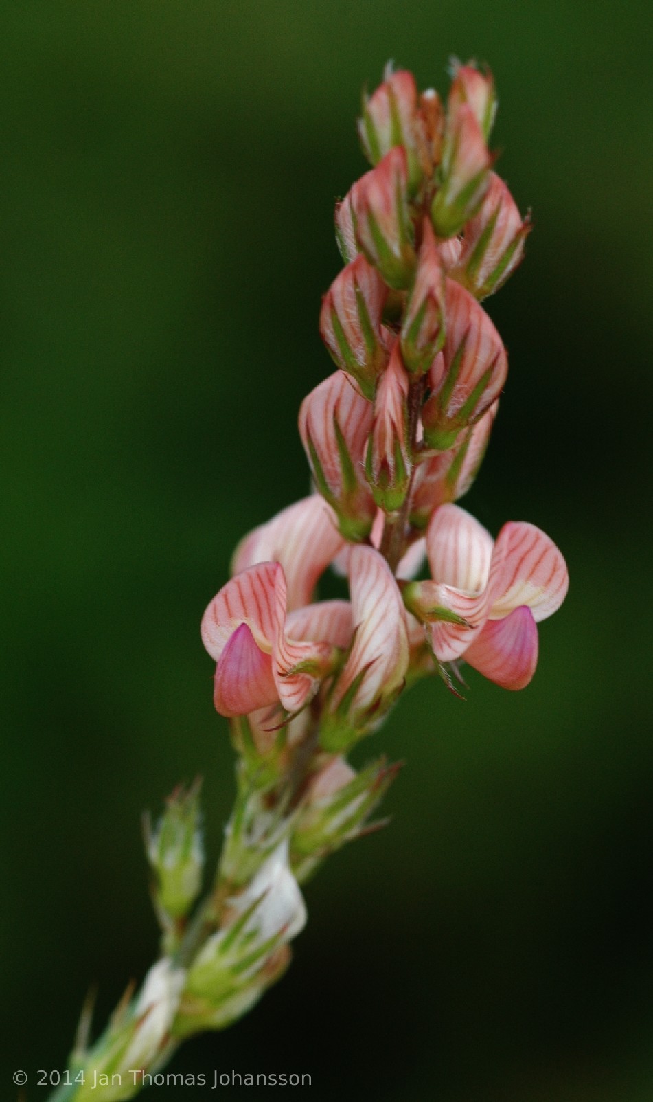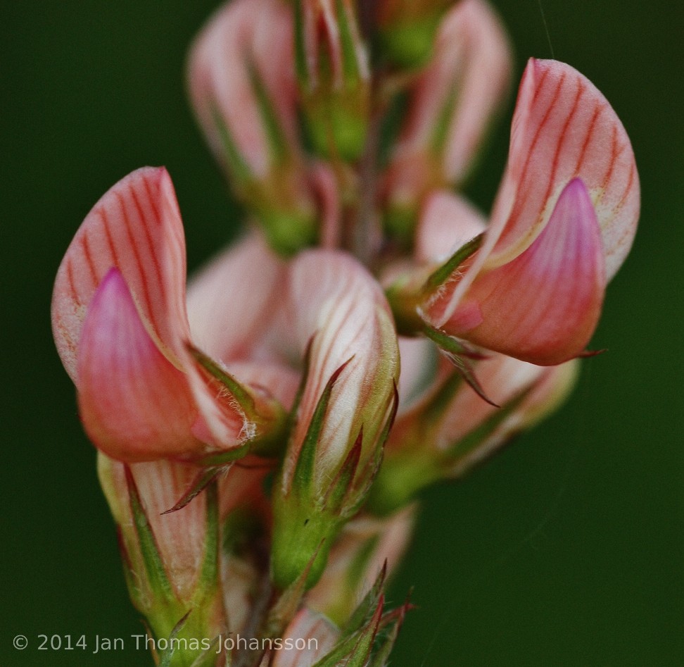 Blütenstiel deutlich länger als das zugehörige Blattpaar Blütenstand vor der Blüte, schmal zylindrisch, zur Fruchtzeit deutlich verlängert Krone 6 - 9 mm, rosa mit dunkleren Adern, Fahne 5 - 7 mm, länger als das