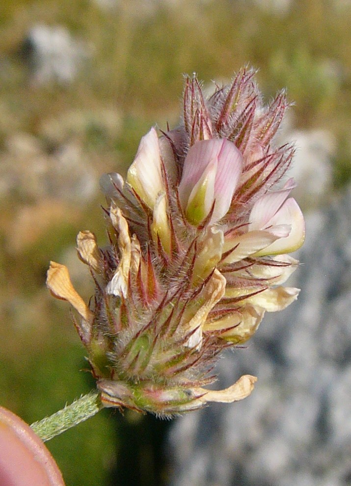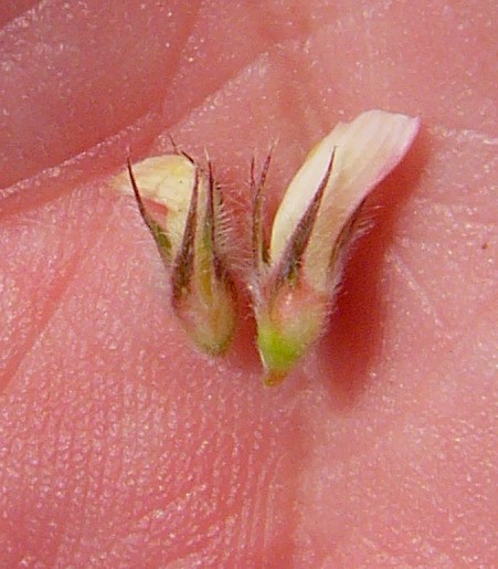 Blütenstiel deutlich länger als das zugehörige Blattpaar Blütenstand vor der Blüte, schmal zylindrisch, zur Fruchtzeit deutlich verlängert Krone 5 - 7 mm, hellrosa mit dunkleren Adern, Fahne 5 - 7 mm, länger als das