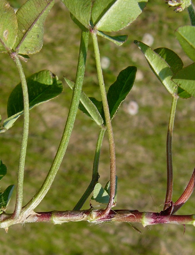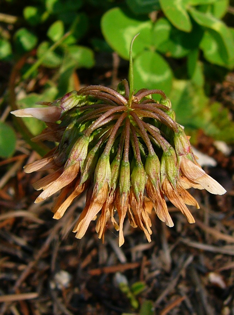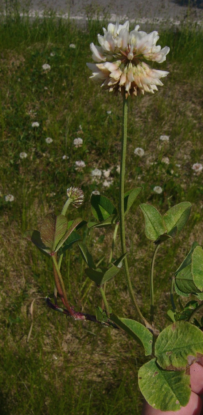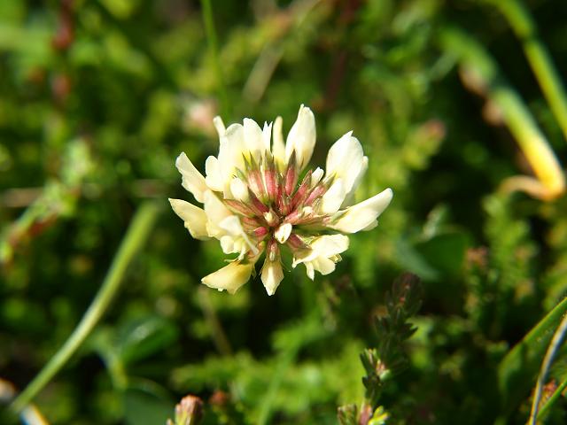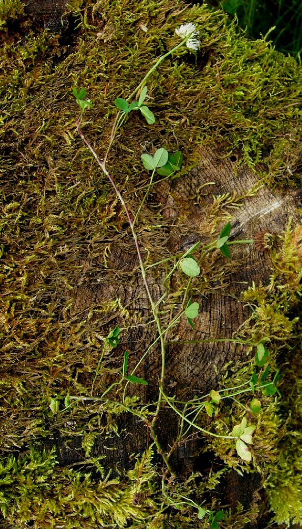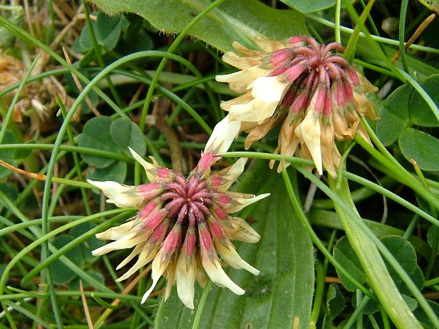 Trifolium - Blütenstand vielblütig, ohne Hülle, Blüten weiß, hellgelb, rosa, deutlich länger als der Kelch, Kelch zur Fruchtzeit nicht aufgeblasen, Blätter kahl, Blättchen rundlich- eiförmig, Stängel kriechend