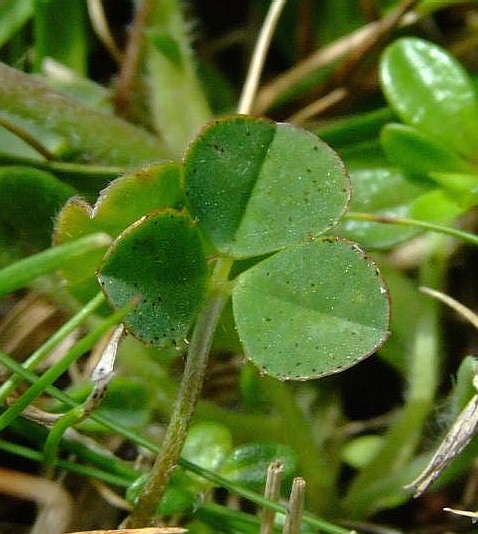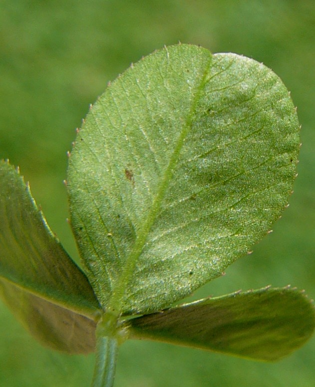 Blätter 3- teilig, Blättchen +/- rundlich, 6 - 10 mm lang, ohne weiße Zeichnung, schwach gezähnt, vorne stumpf oder ausgerandet, beiderseits kahl