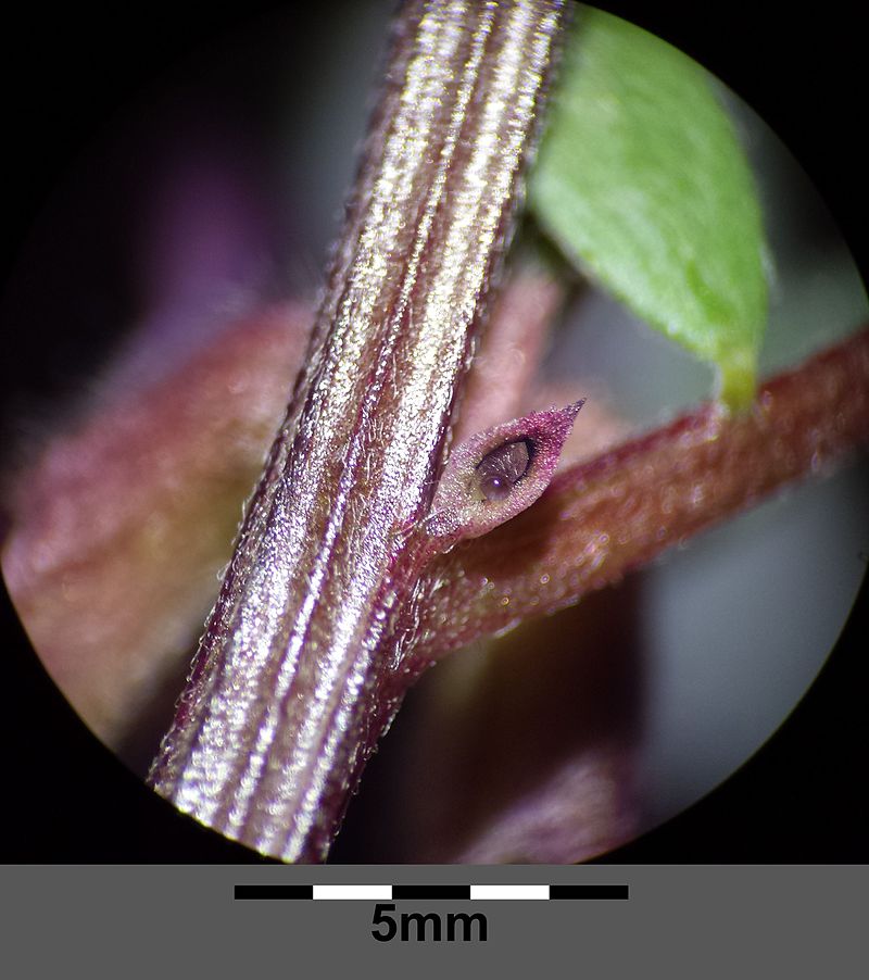 Fahne behaart, braun gestreift,  Blüten und Kelch behaart,