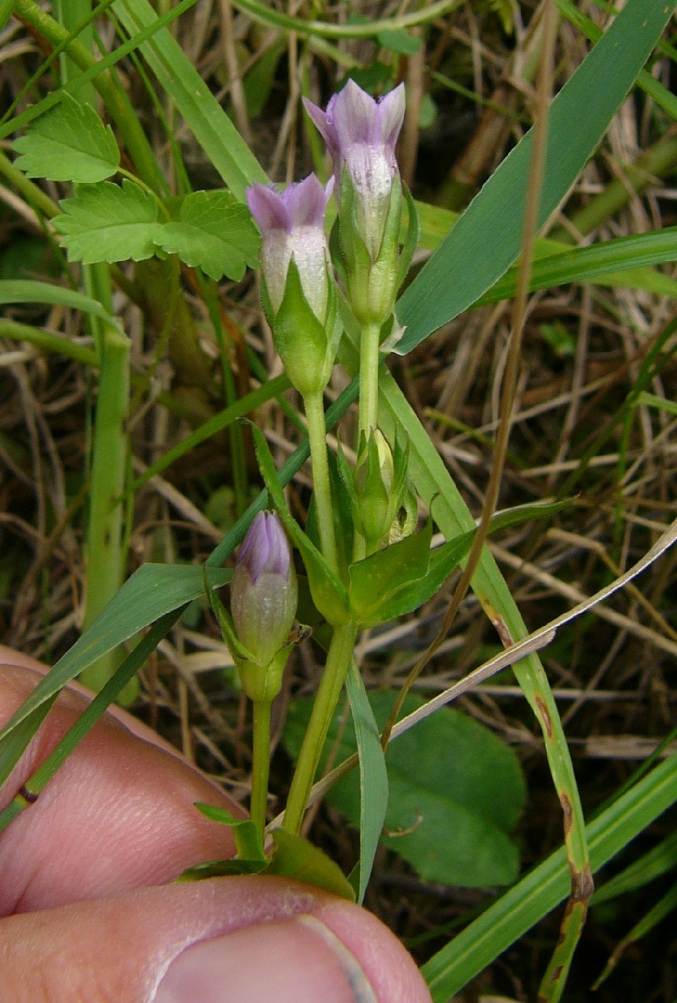 Gentianella- Blüten mit 5 Kronblattzipfeln, Kelchzipfel am Rand grün oder rot, deutlich papillös