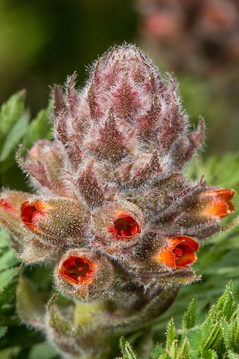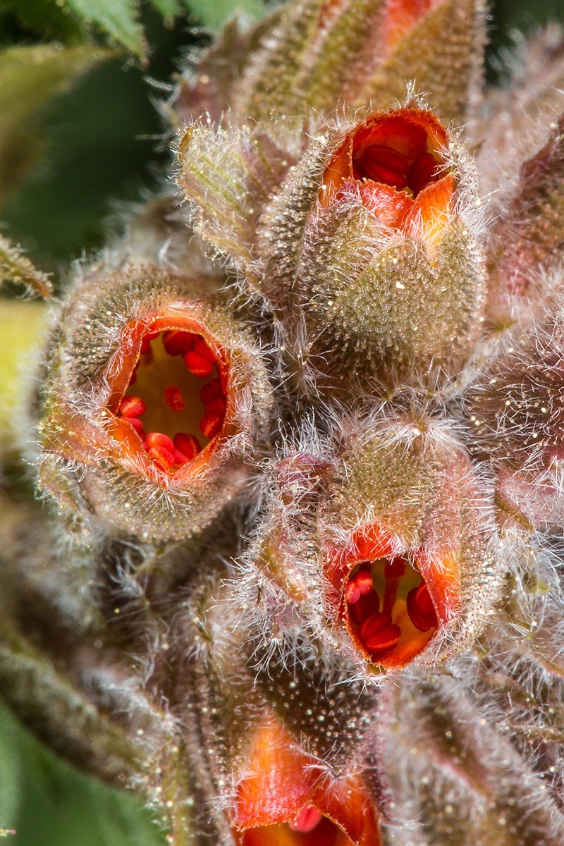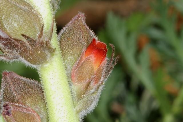 Kelchblätter drüsig behaart, braun, deutlich länger als die Hochblätter und ungefähr so lang wie die orangeroten Kronblätter, 10 Staubblätter mit orangen Staubbeuteln, Fruchtknoten 5- teilig