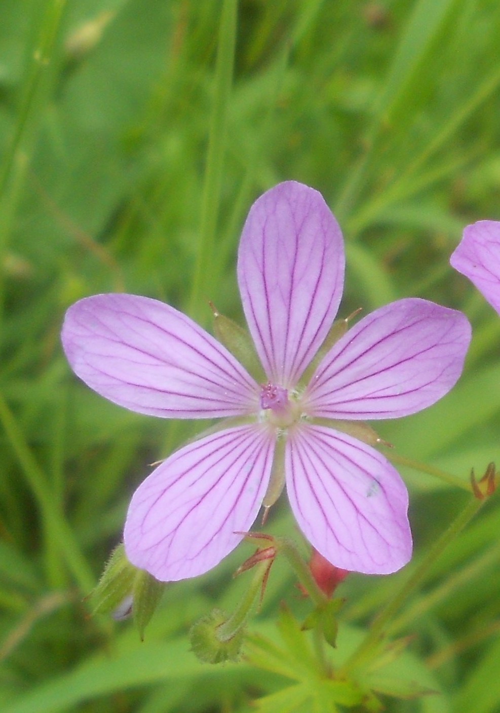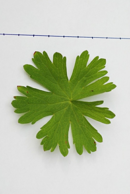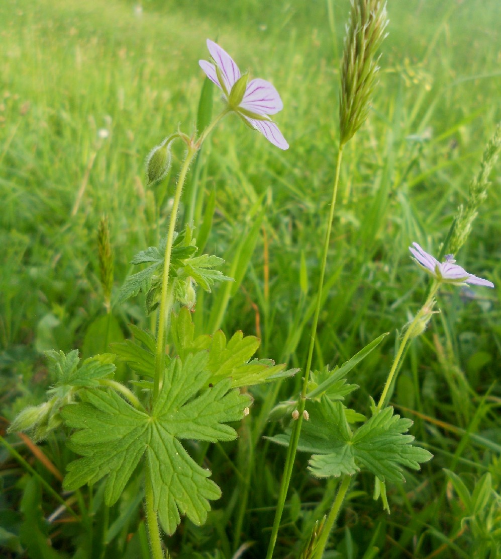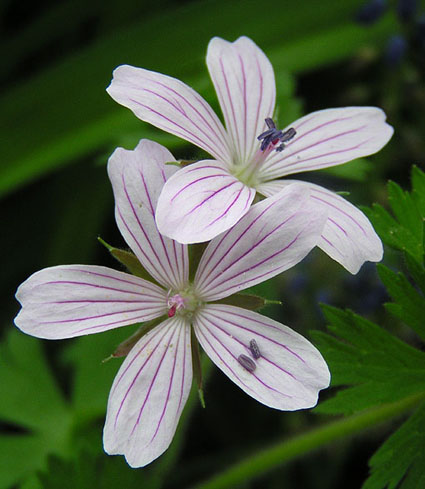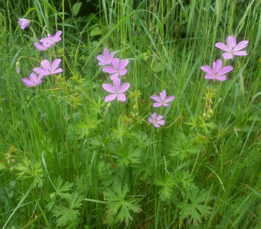 Geranium - Teilblütenstände mit 2 Blüten, Blüten groß, rosa, ausgebreitet, Nervatur undeutlich oder nur Hauptader deutlich, Kronblätter doppelt so lang wie breit, Staubblätter nicht aus der Blüte herausragend, Blätter gelappt, mit +/- breiten Fiederabschnitten