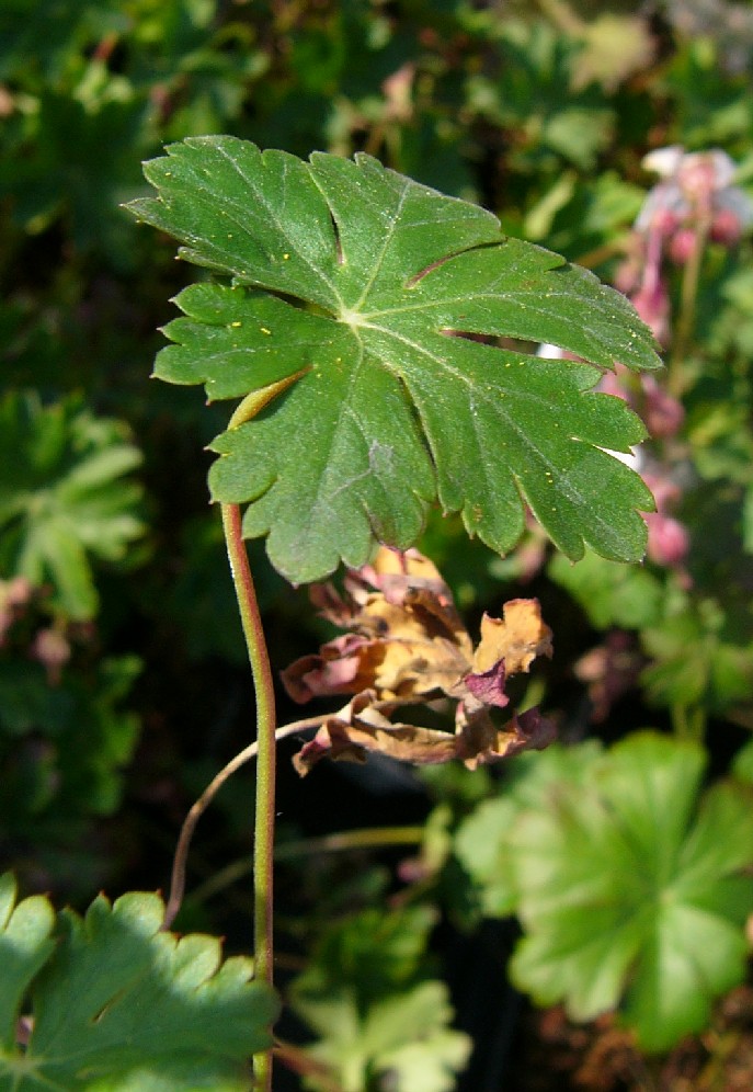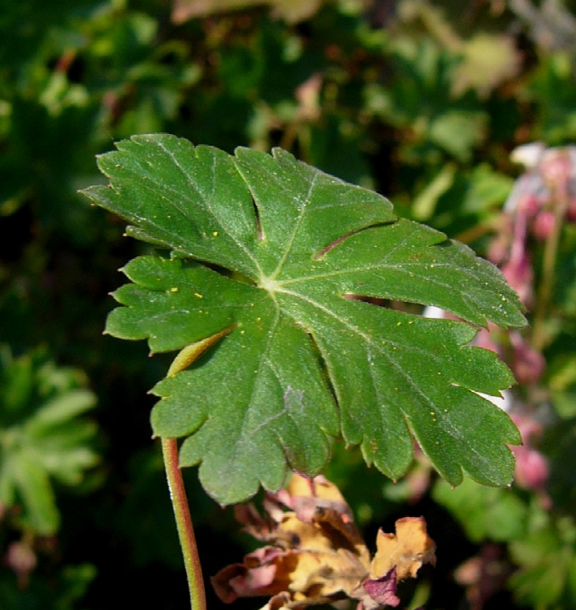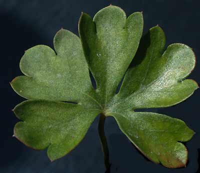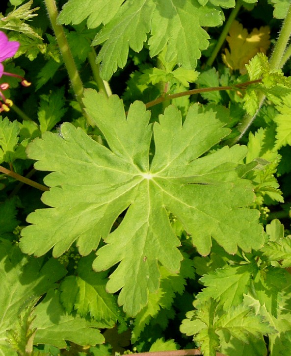 3 Blätter 2,5 - 4 cm im Durchmesser, kahl, fast bis zum Grund in 5 - 7 Lappen eingeschnitten, Lappen vorne gefiedert, mit mehr als 3 Abschnitten