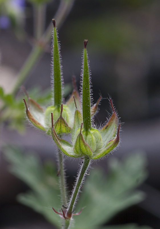 Frucht mit Schnabel 2,5 – 3 cm lang, im unteren, verdickten Teil ohne Querrippen, aber lang behaart, Fruchtklappen glatt, dicht drüsenhaarig