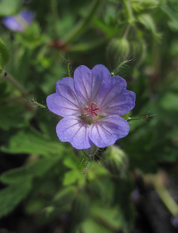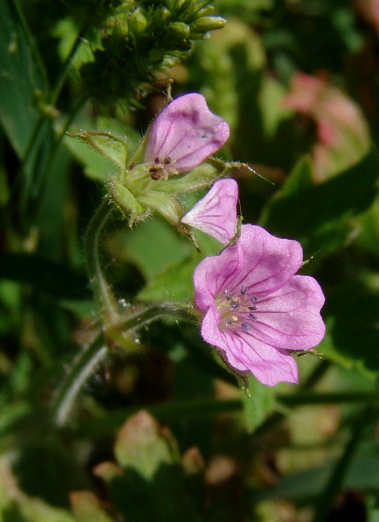 Kronblätter 5 - 7 mm lang, hellrosa oder fast weiß, dunkel geadert, etwas ausgerandet, Kelchblätter behaart, kurz begrannt