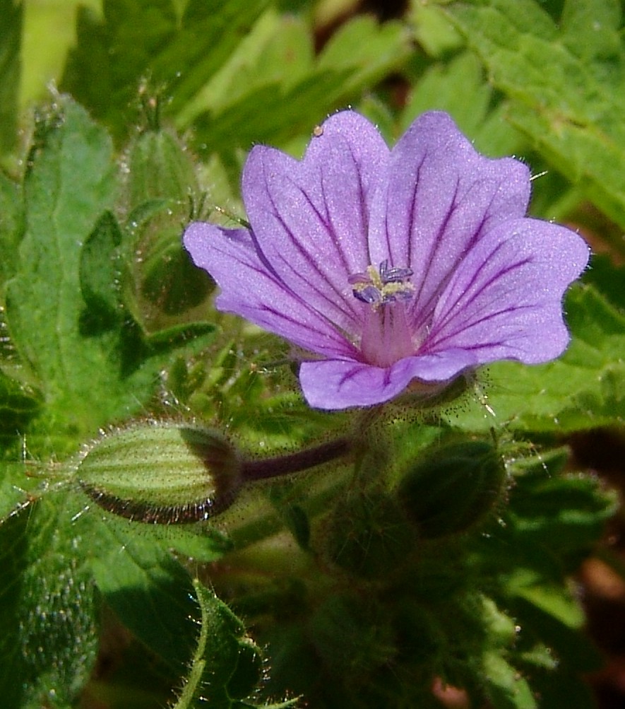 Kronblätter 5 - 7 mm lang, rosa bis hellviolett, dunkel geadert, etwas ausgerandet, länger als die Kelchblätter, Staubbeutel lila, Staubfäden kahl