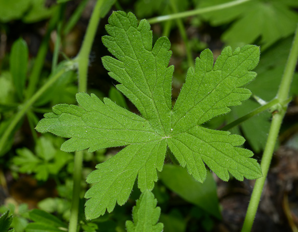 Blätter ungleich lang gestielt, bis über die Mitte tief gespalten, ihre Spreiten im Umriss eckig