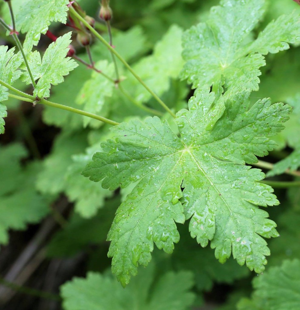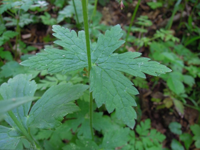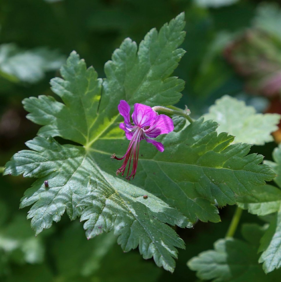 rosa, vor allem auf den Adern drüsenhaarig, Blätter lang gestielt, 5 - 10 cm im Durchmesser, zu 75 % eingeschnitten