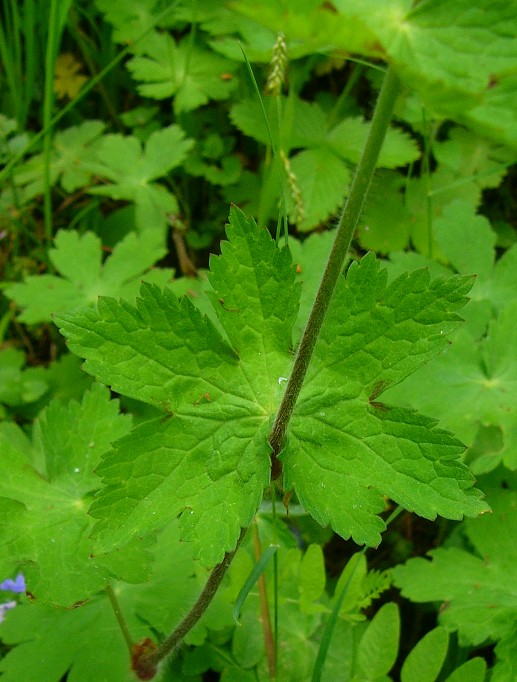 Grundblätter lang gestielt, 5 - 10 cm im Durchmesser, mit anliegenden drüsenlosen und drüsigen +/- abstehenden Haaren