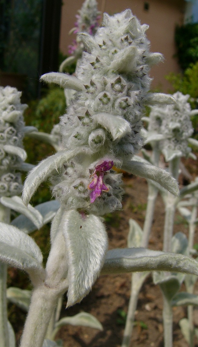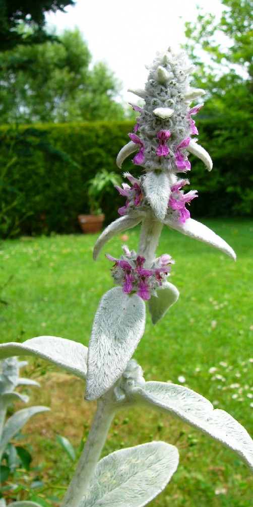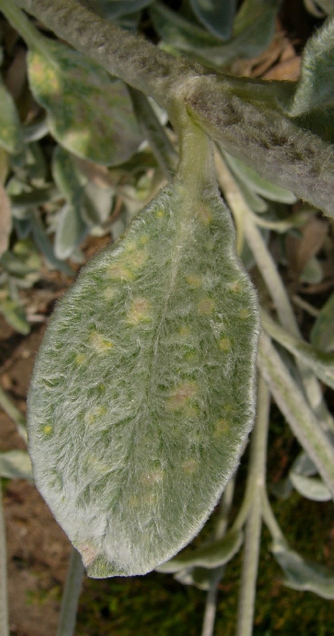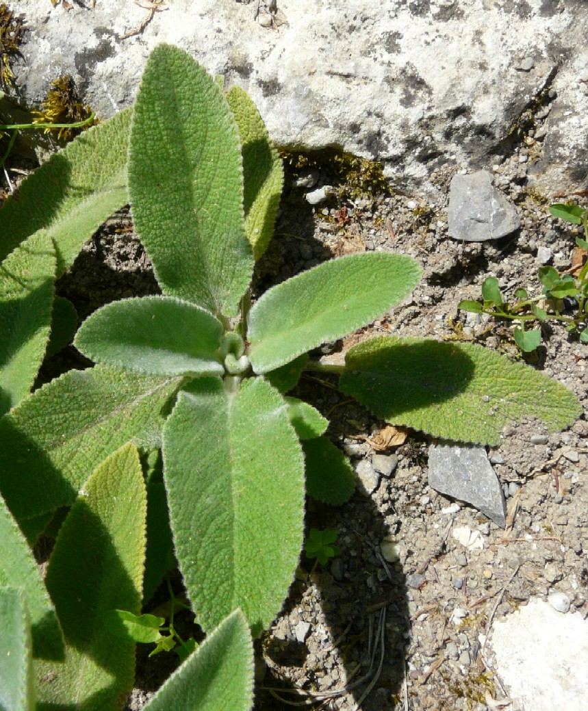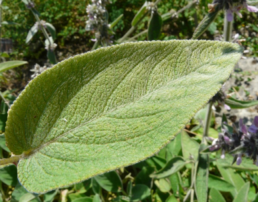 Blätter 30 - 120 mm lang, 10 - 50 mm breit, länglich eiförmig, stark behaart, jung silbergrau, später grün, ringsum fein regelmäßig gekerbt, grüne Blattfläche unter der wollig- filzigen Behaarung sichtbar