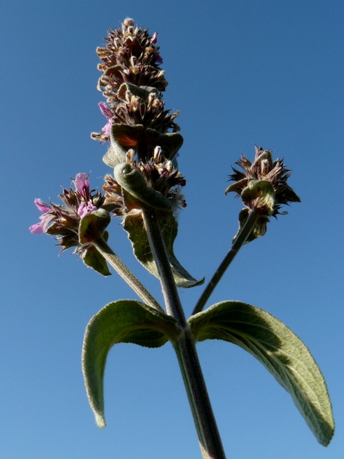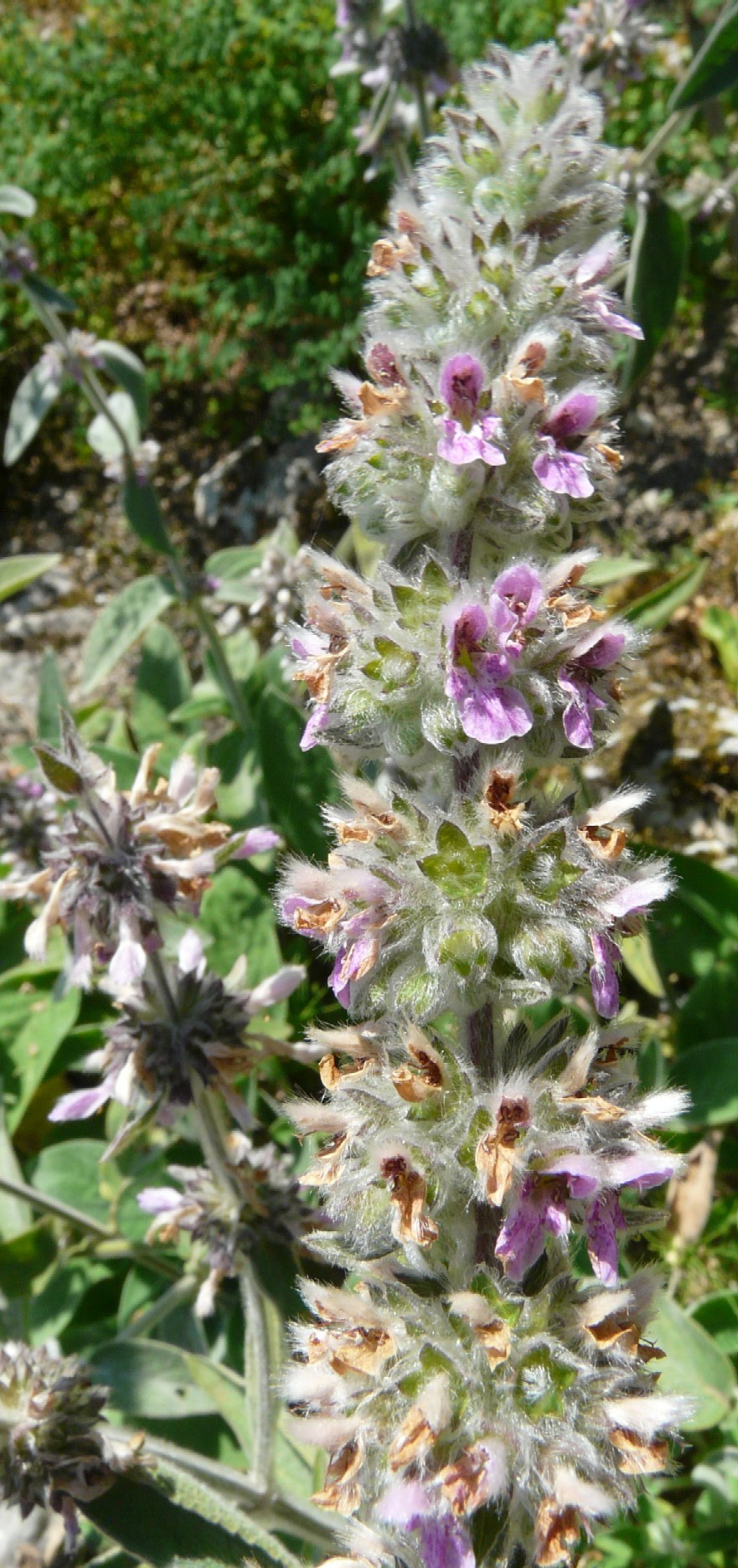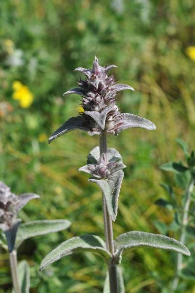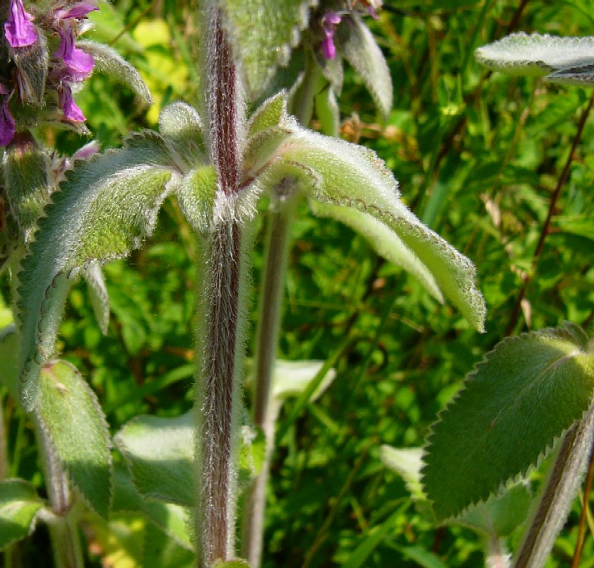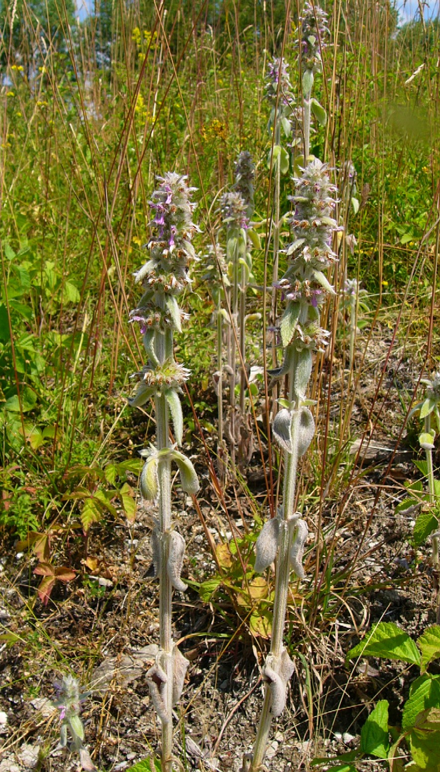 Stachys- Pflanzen +/- krautig, Blüten rot, Stängel wollig, Obere Quirle bilden eine lange Scheinähre