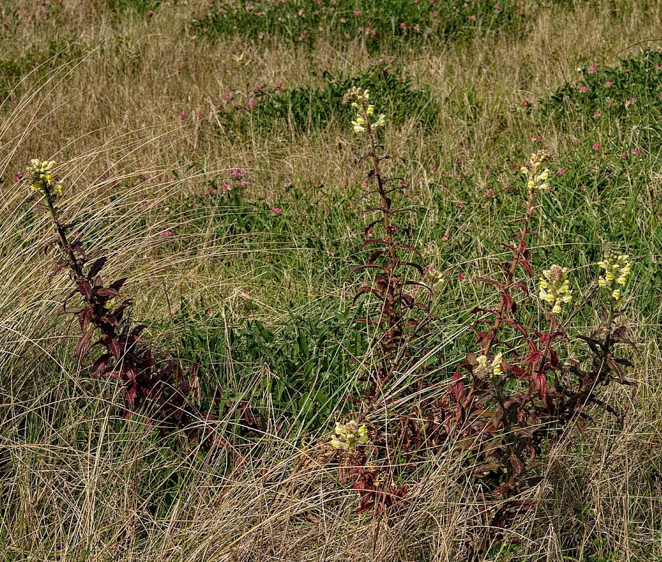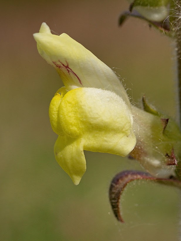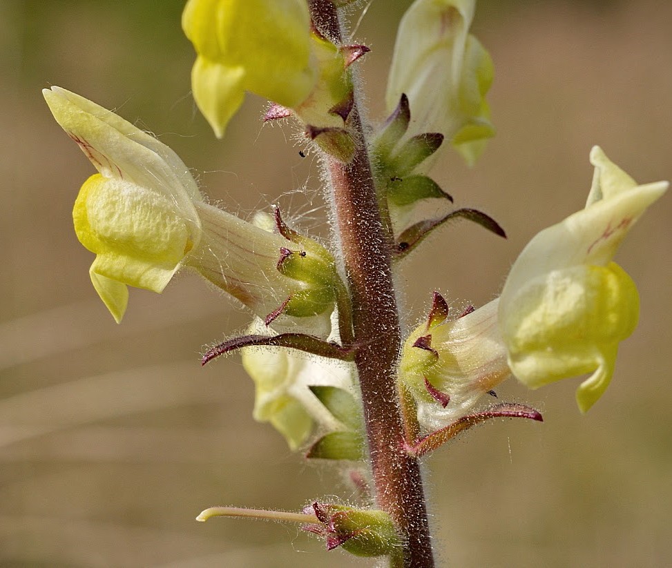 Blüten hellgelb, 28 - 30 mm lang, drüsig behaart, Oberlippe, 2- lappig, ca. 3 mm tief eingeschnitten mit violettroten Adern, Unterlippe 3- teilig, Gaumen verschlossen, gelb
