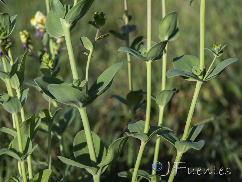 Blätter elliptisch, 6 - 36 mm lang, 5 - 25 mm breit, vorne stumpf, fleischig, kahl, nur die obersten wechselständig, mittlere und untere Blätter im Wirtel zu 3