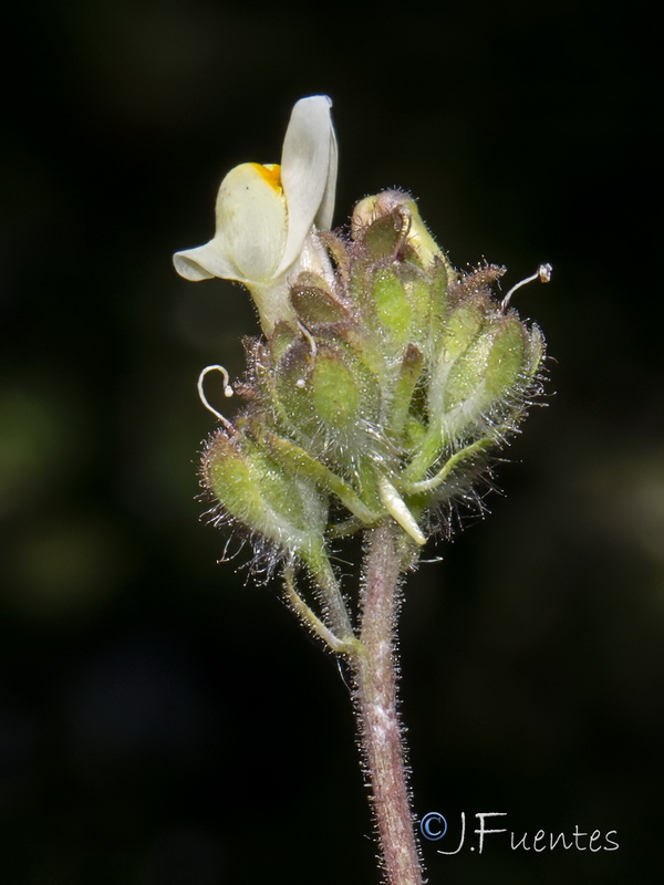 Portugal, Spanien Oberlippe/Sporn violett, Unterlippe weiß, ohne Zeichnung Kelch und Blätter mit kurzen Drüsenhaaren > Linaria intricata