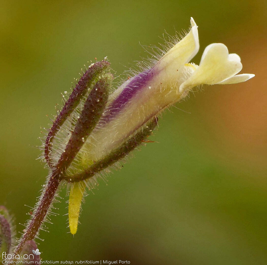 Kronröhre 5 - 5 mm lang, 2 mm breit, cremefarben mit hellviolettem Rücken oder dunkelviolett, Sporn kurz- konisch, 3 - 4 mm lang, 0,8 mm breit