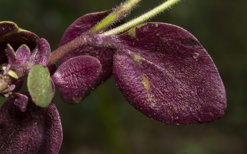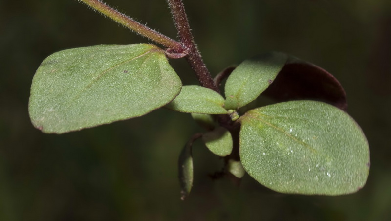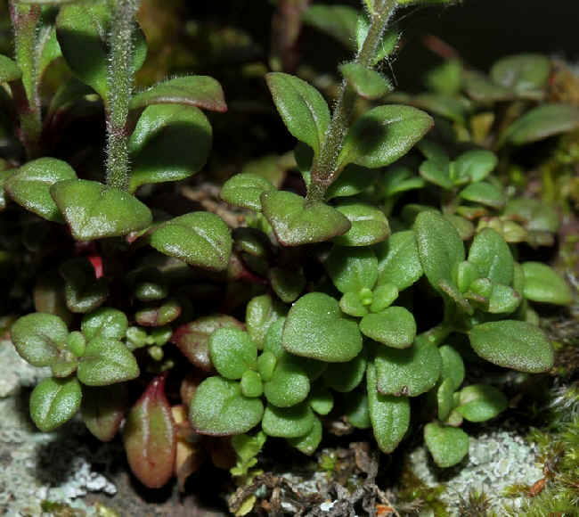 kräftigen Längsrippen Blätter elliptisch, bis 23 mm lang, 10 mm breit, +/- fleischig, in den kurzen Stiel verschmälert, kahl oder drüsig behaart, beiderseits grün oder auf der Unterseite rot