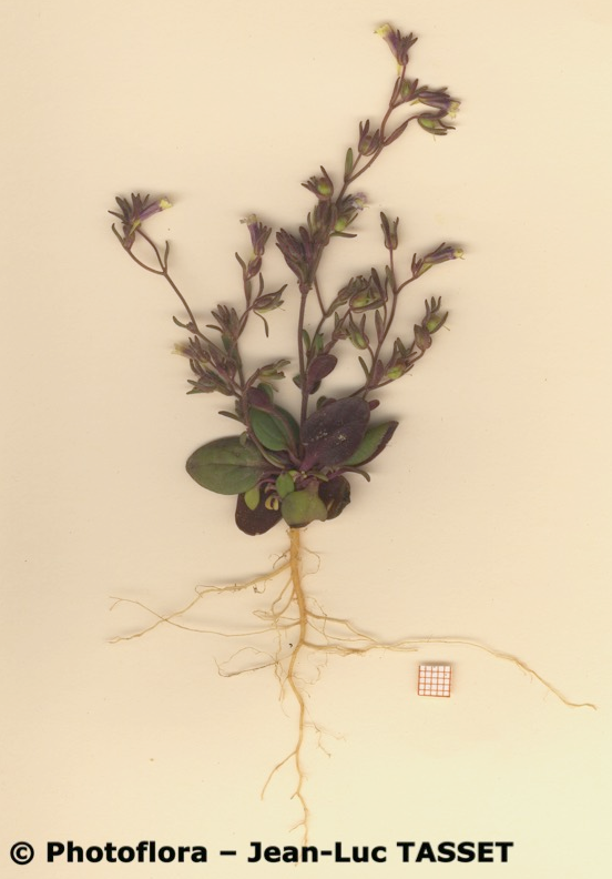 2 Blüten kleiner 8 mm, Stängel mit wenigen kleinen Blätter, am Grund mit Blattrosette