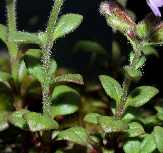 Stängel violett, drüsig behaart, Stängelblätter gegenständig, viel kleiner als die unteren Blätter, linealisch- lanzettlich, manchmal auch fehlend