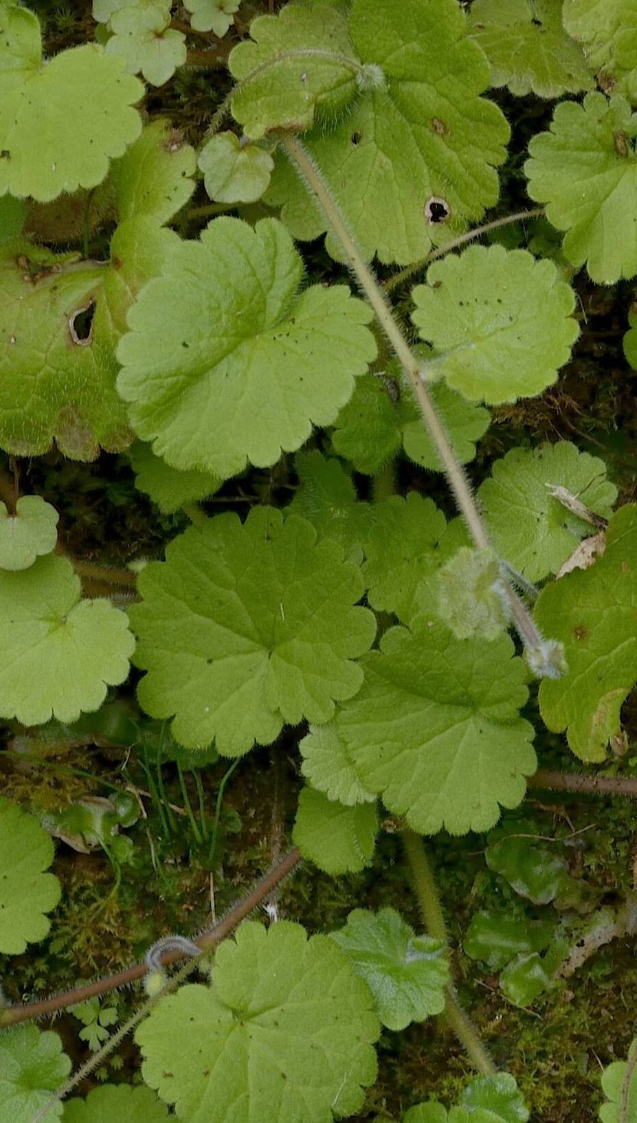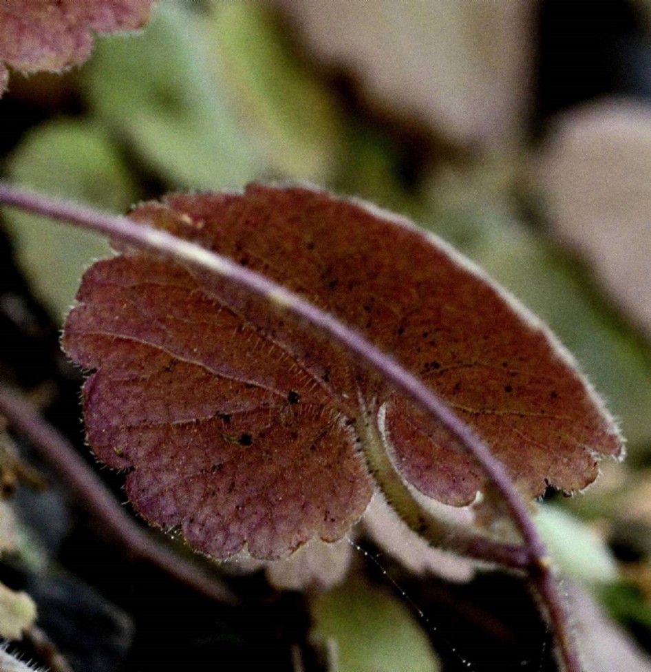 Blätter rundlich- nierenförmig, 6 - 15 mm im Durchmesser, mit 9 - 13 stumpfen oder spitzen Lappen, auf der Oberseite mit kleinen Warzen, am Rand und meist auch auf der Fläche borstig- langhaarig, mit langem, abstehend behaartem Stiel