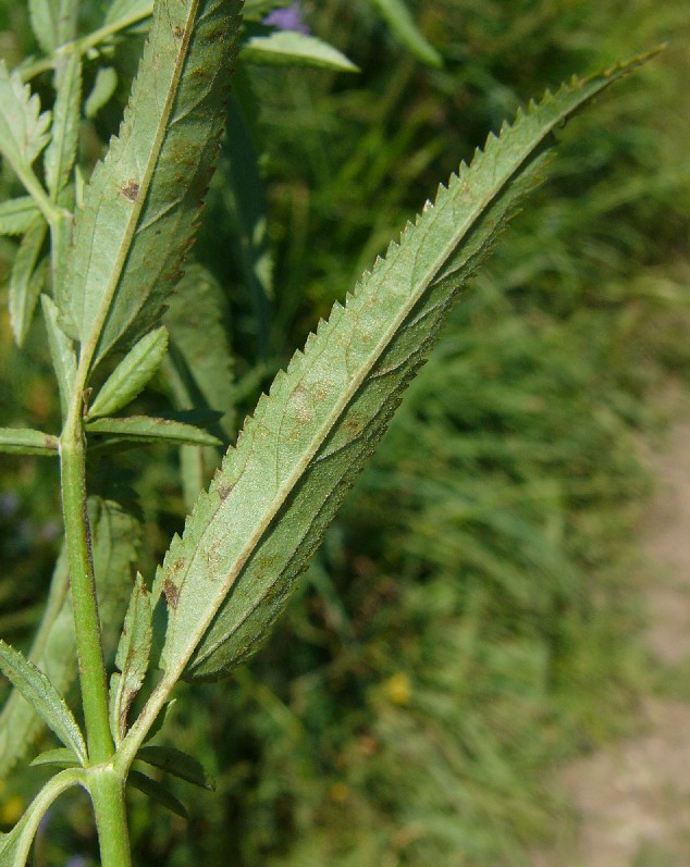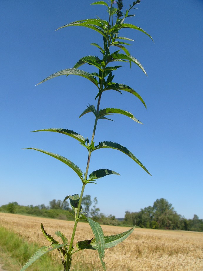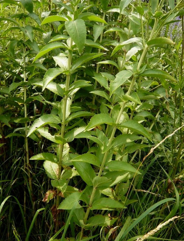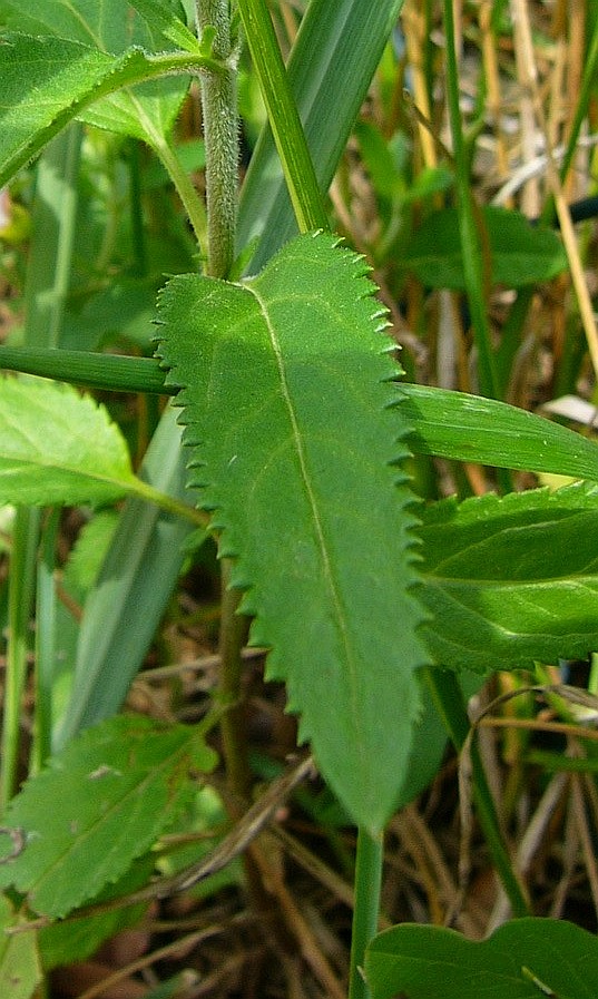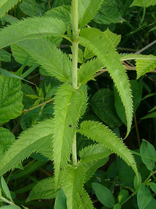 Stängel oben dicht, fast filzig mit 0,2 - 0,5 mm langen, Stängel im unteren Teil kahl Blätter gegenständig oder zu 3 - 4 im Wirtel Stängelblätter scharf gesägt, 5 - 13 cm lang, spitz