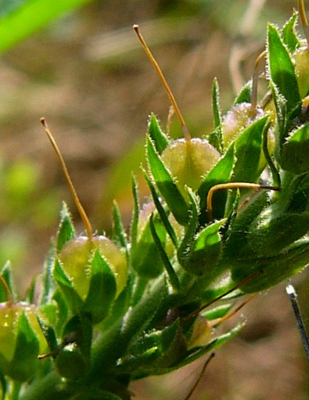 Fruchtstiele meist mehr als 1,5 mal so lang wie ihr Deckblatt, Deckblätter lanzettlich, meist mit sehr kurzen Drüsenhaaren besetzt (Lupe!) Stängel oben mäßig dicht, fast filzig mit 0,1 - 0,2 mm langen,