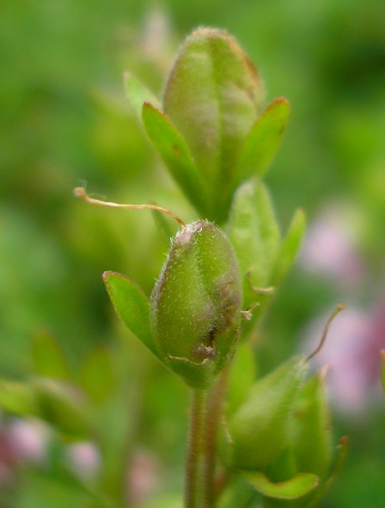 Kapsel breiter als lang, drüsig Blätter eiförmig, schwach gezähnt, bis 15 mm lang