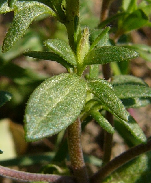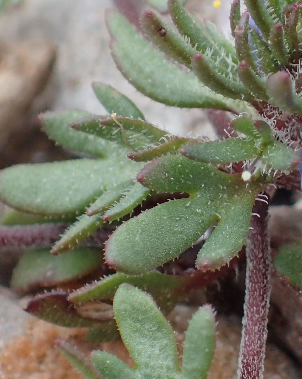 Untere Blätter elliptisch, ganzrandig oder schwach gelappt, 3 - 7 mm lang gestielt, schwach behaart, unterseits oft violett