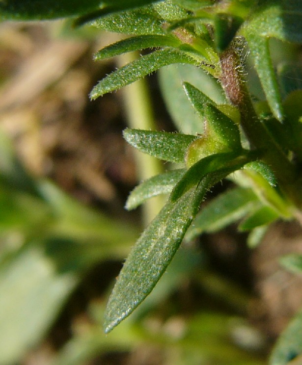 Tragblätter der oberen Blüten mit 3 langen, linealischen Blattlappen, im unteren Teil steif bewimpert, länger als der Kelch, mit deutlichen Nerven Untere Blätter 3 - 5- lappig, 6 - 16 mm lang, am Grund bewimpert, 3 - 6 mm lang gestielt