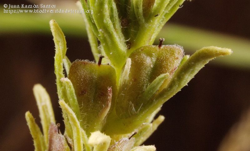Früchte dreieckig, spärlich kurzhaarig, 4 - 5 mm lang, vorne gestutzt, Griffelbucht fast fehlend, Kelch 2 - 10 mm lang, mit linealischen, bewimperten Kelchzipfeln