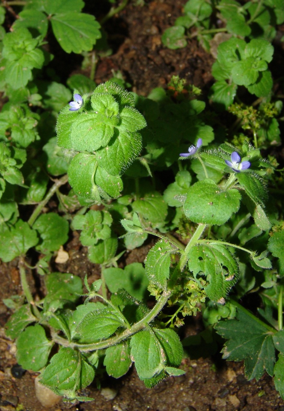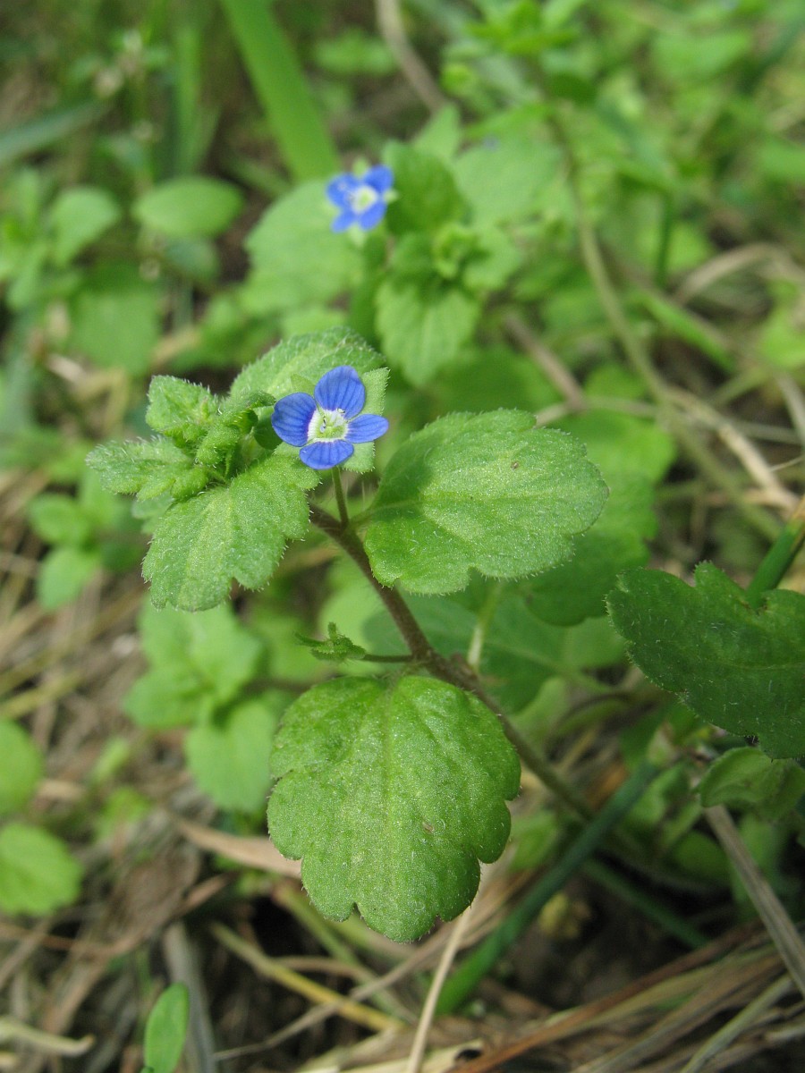 Blüten klein (5 - 7 mm), kräftig blau, oft mit violettem Ring, Kelchblätter breit