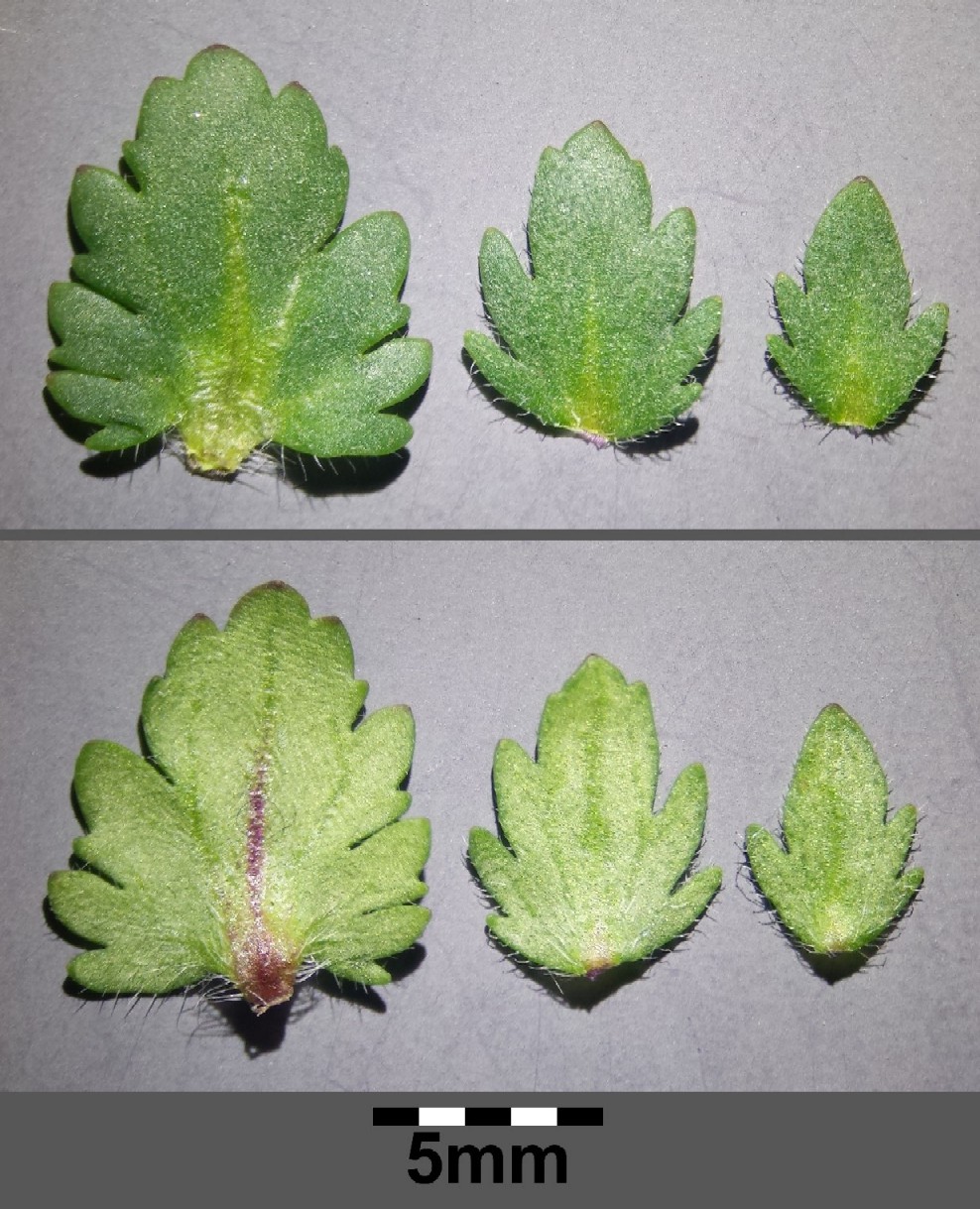 Blätter glänzend, oberseits +/- kahl, tief eingeschnitten Kelchblätter locker kurzhaarig, Griffel an der Frucht deutlich länger als die Griffelbucht > 3