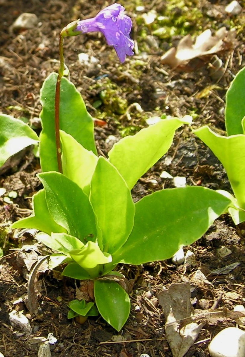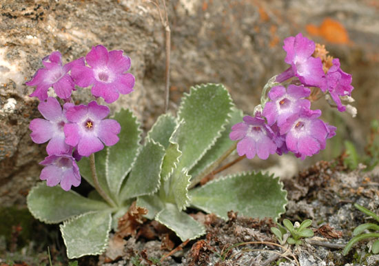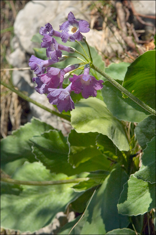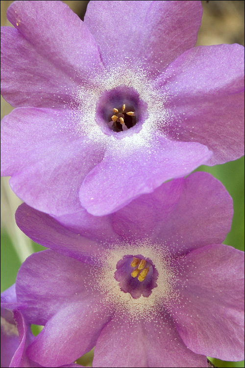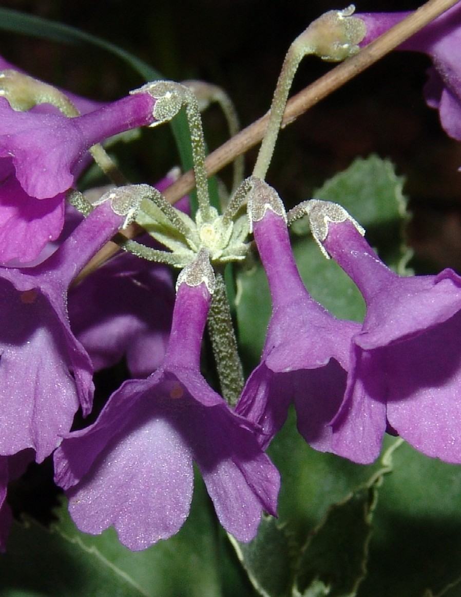 Primula - Blüten rosa oder violett, mit bemehltem Schlund, Blätter ohne lange Drüsenhaare