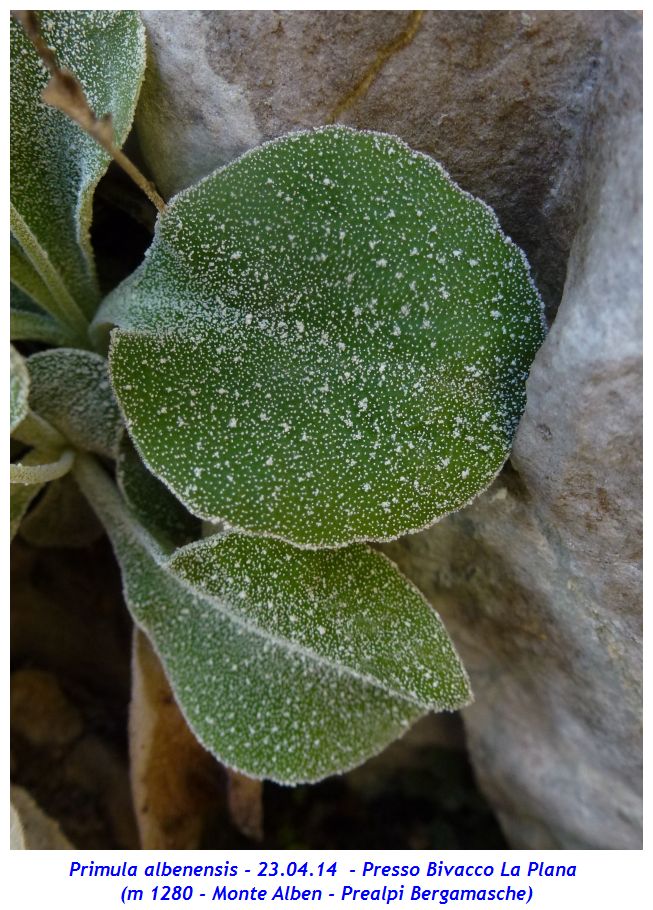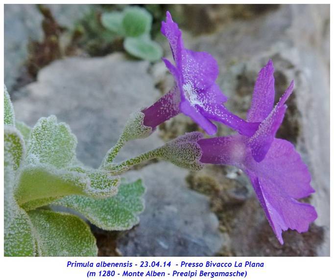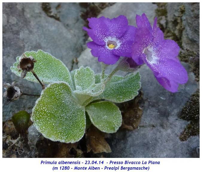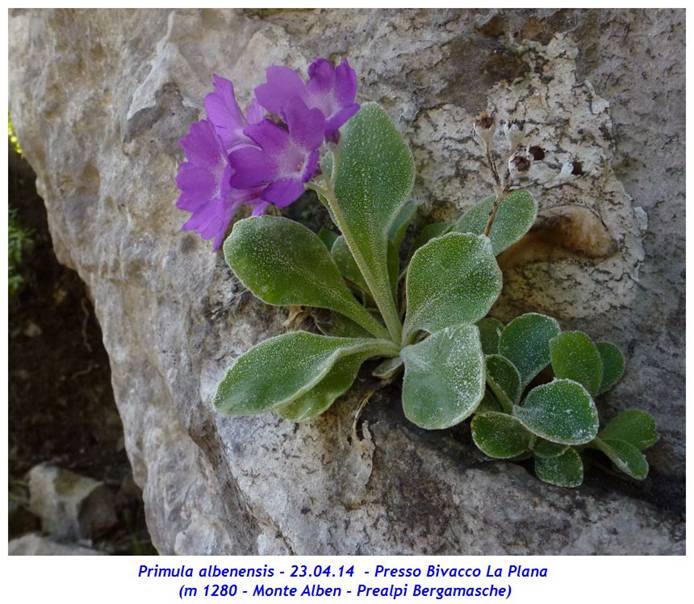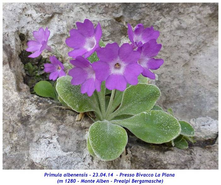 IV - VI, Felsen, (600 - 1800 m) Synonyme: English name: Weltweite Verbreitung: Die Pflanze wurde 1988 von Enrico Banfi und Renato Ferlinghetti auf dem Monte Alben (zwischen Comer See und Iseosee) entdeckt. Später wurde ein weiteres Vorkommen von Primula albensis ca. 20 km nordöstlich (Val d'Ancogno bei Rava) gefunden.