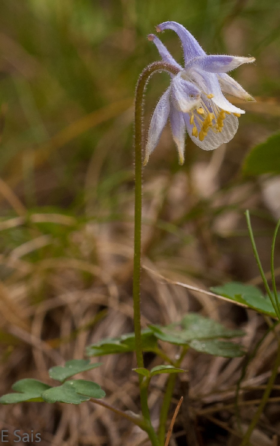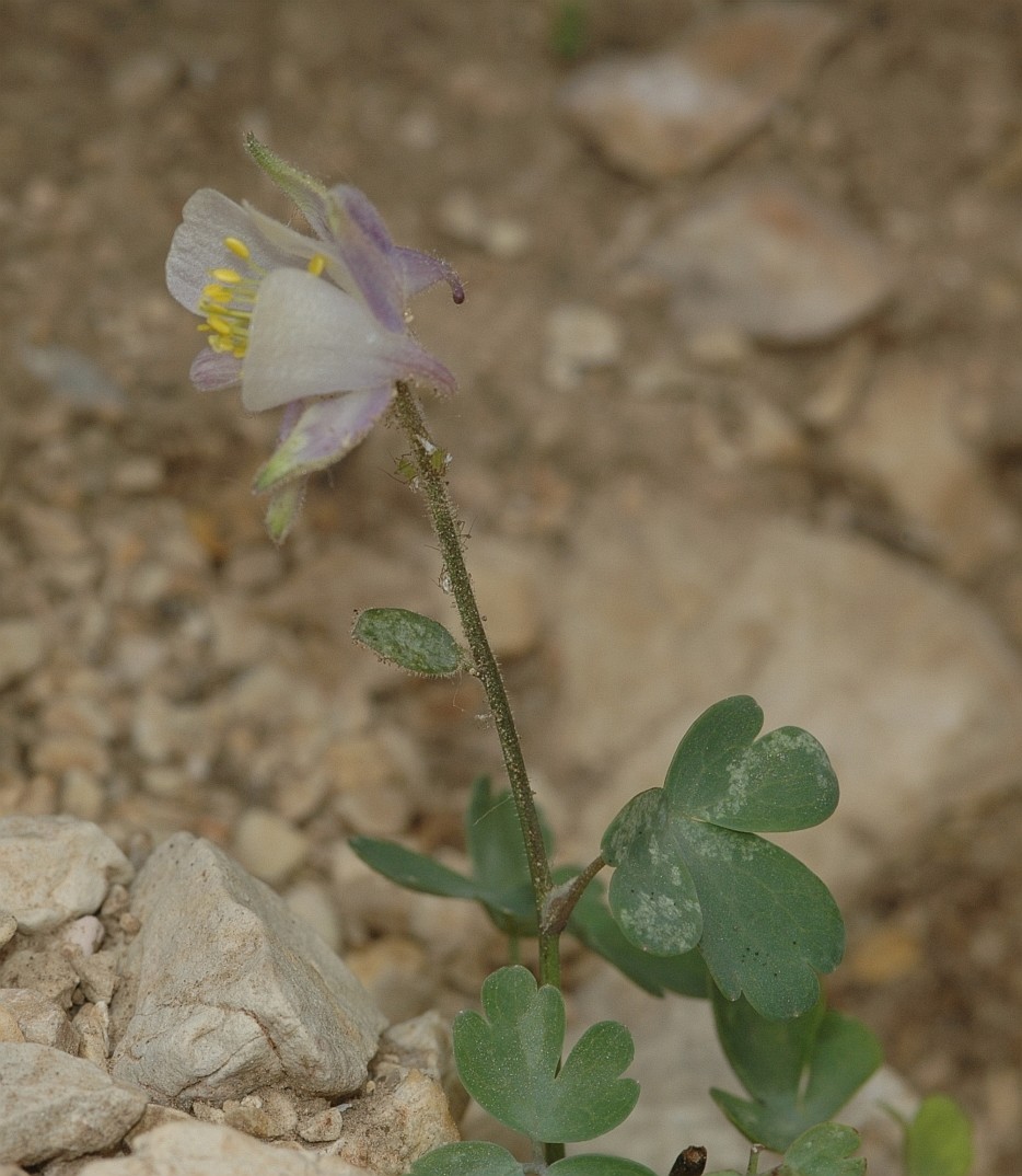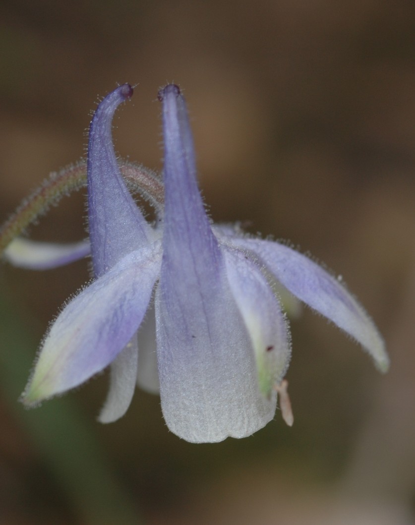 Blüten 1- oder 2-farbig, weißlich oder hellblau, Kelchblätter 10 - 20 mm lang, 5 - 7 mm breit, lanzettlich, Platte der Kronblätter 6 - 11 mm lang, 4 - 6 mm breit, länger als breit, meist länger als der Sporn, Sporn 5 - 12 mm lang, fast gerade oder hakig gekrümmt