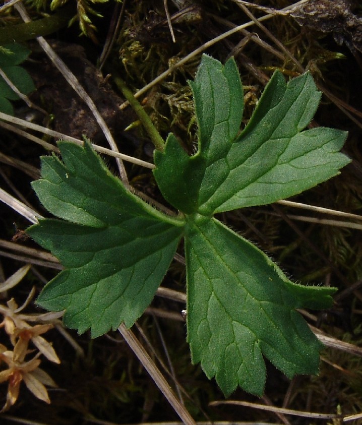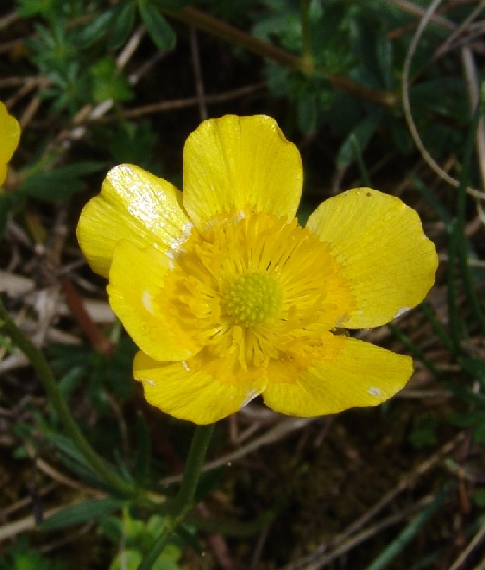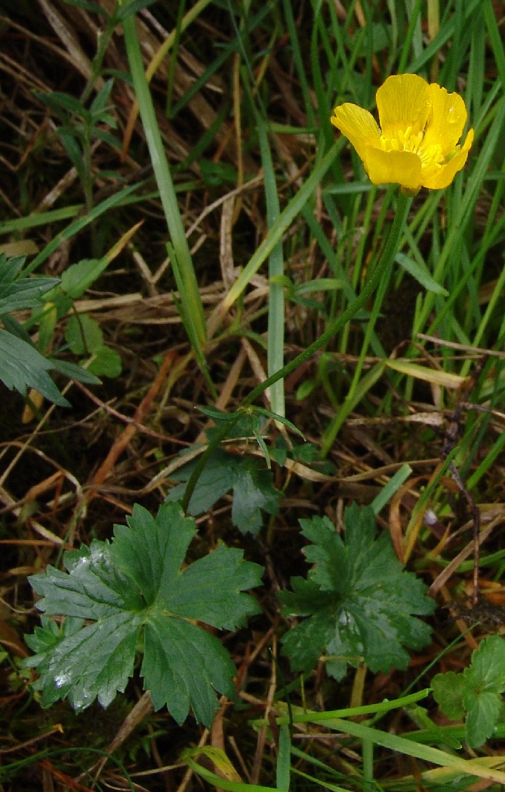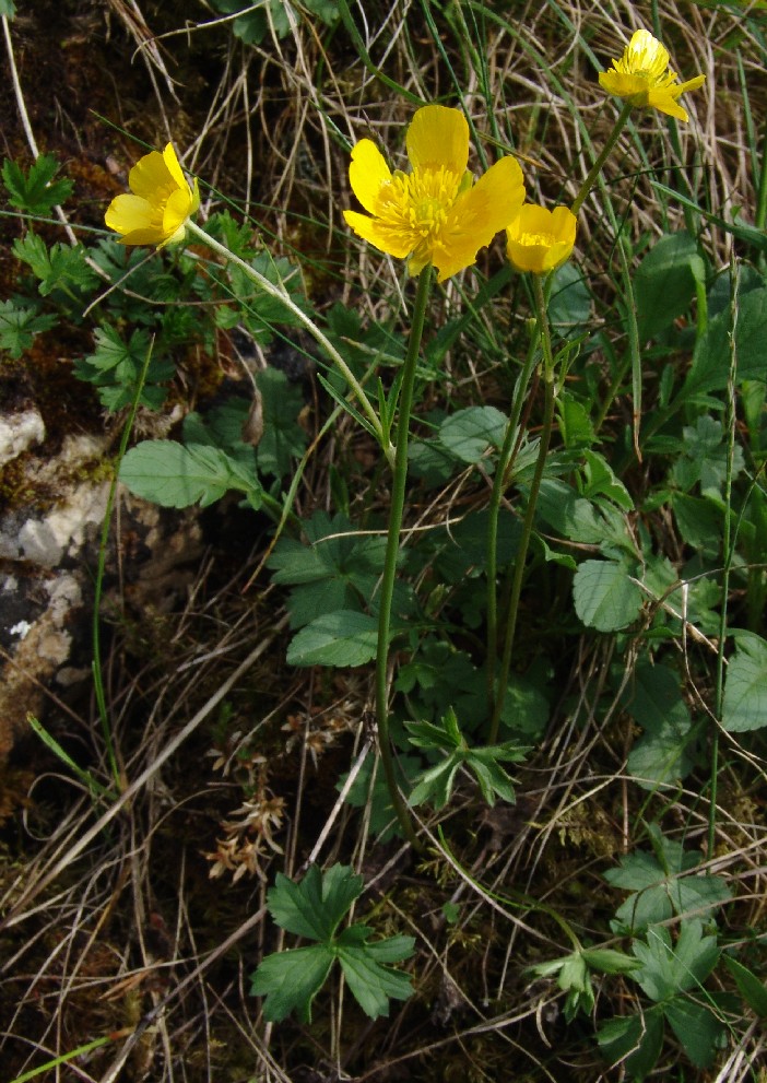Ranunculus - Pflanze 10 - 15 cm hoch, 1- 3- blütig, Blüten gelb, Kelchblätter anliegend, obere Stängelblätter fast bis zum Grund eingeschnitten, mit +/- ganzrandigen Abschnitten, Abschnitte linealisch, 8 - 12 mal so lang wie breit, nicht halbstängelumfassend, sitzend, Blätter gelappt, behaart, Frucht seitlich zusammengedrückt, Stängel kahl oder anliegend behaart, Blütenstiel rund